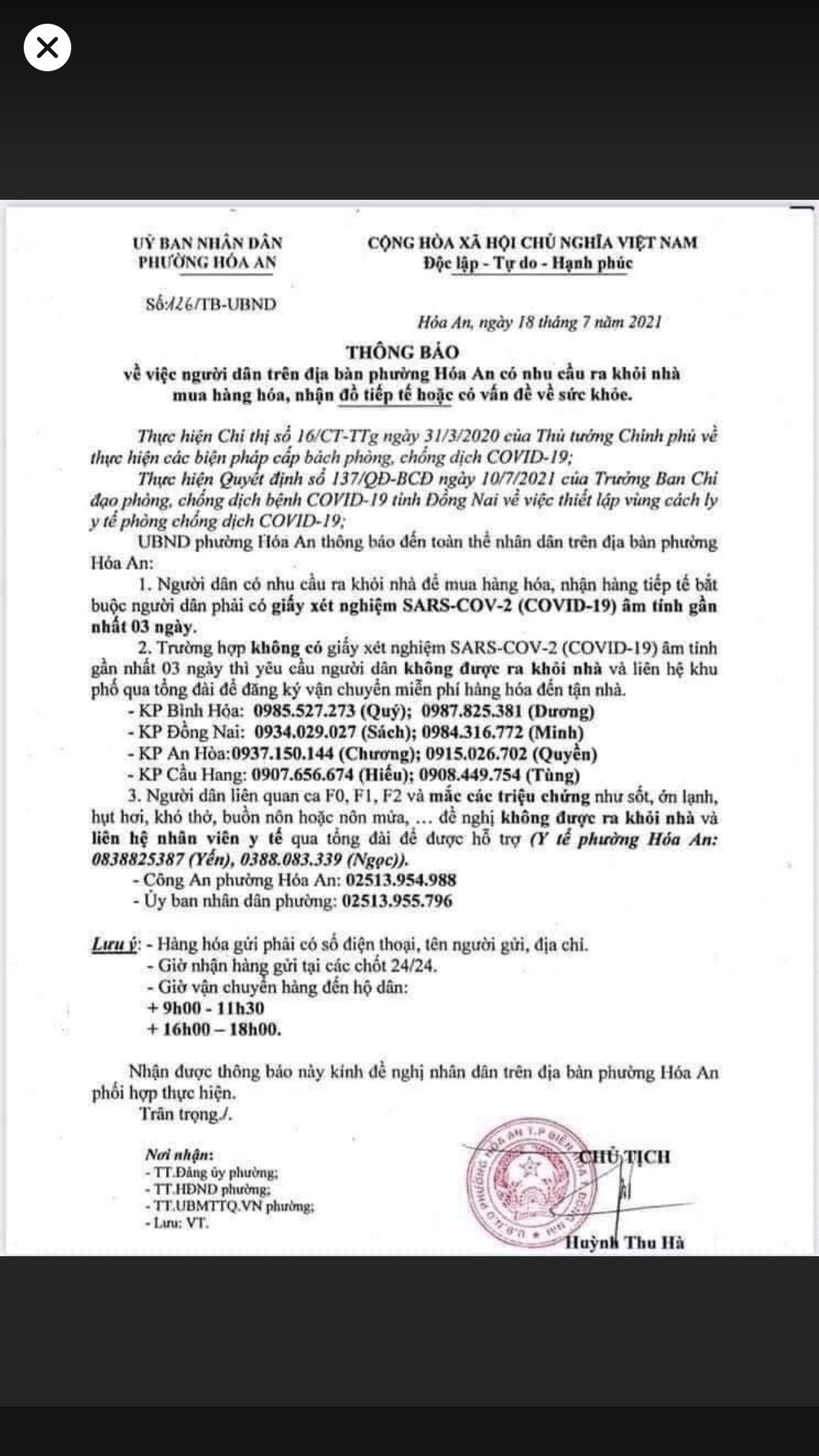 Trước đó ngày 18/7, UBND phường Hóa An (TP Biên Hòa) ra thông báo quy định: "Người dân có nhu cầu ra khỏi nhà để mua hàng hoá, nhận hàng tiếp tế bắt buộc phải có giấy xét nghiệm SARS-CoV-2 âm tính gần nhất 3 ngày"