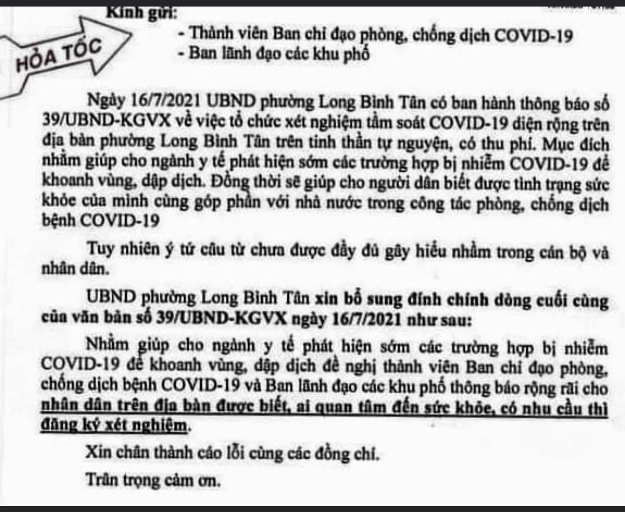 Ngày 19/7, UBND phường Long Bình Tân, TP Biên Hoà cho biết đã ra văn bản mới đính chính lại văn bản kêu gọi toàn dân trong phường đi xét nghiệm tầm soát COVID-19 có trả phí.