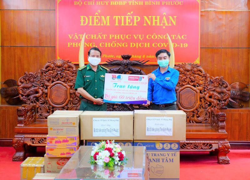 Tại Bình Phước, Tỉnh Đoàn - Hội LHTN Việt Nam tỉnh này vừa tổ chức trao tặng vật tư y tế, nhu yếu phẩm và quà tặng ủng hộ phòng, chống dịch cho các đơn vị lực lượng vũ trang Bộ Chỉ huy Bộ đội biên phòng và Bộ Chỉ huy Quân sự tỉnh.