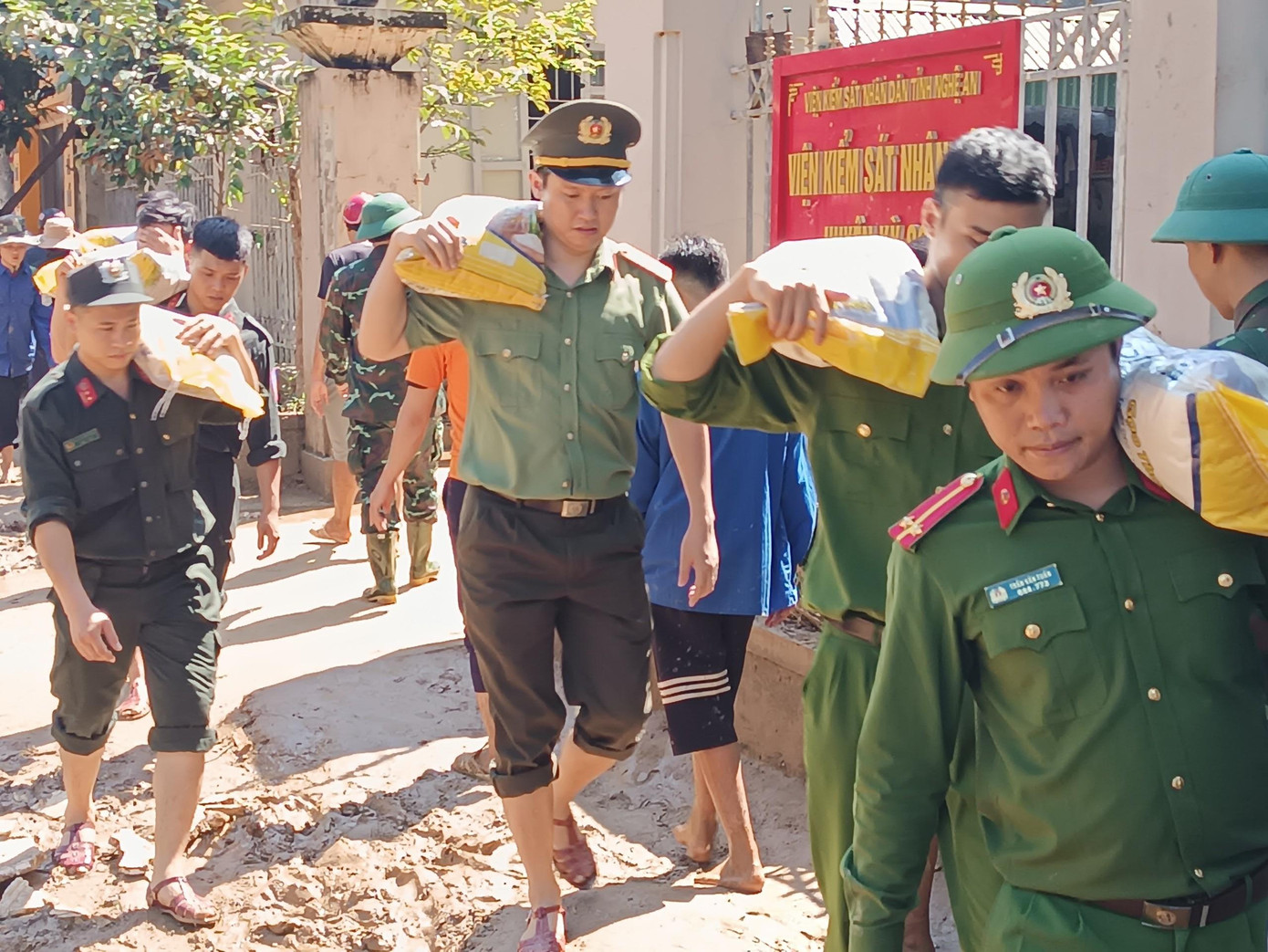 | Đoàn Thanh niên Công an tỉnh Nghệ An cũng đã trao 2 tấn gạo, 700kg muối iot trắng, mì tôm, nước ngọt... cho bà con vùng lũ quét. |