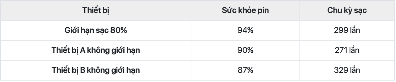 Sau 1 năm thử nghiệm, thiết bị iPhone có bật giới hạn sạc 80% đã thực hiện 299 chu kỳ sạc và duy trì sức khỏe pin ở mức 94%. So với 2 chiếc iPhone 15 Pro Max khác không bật giới hạn sạc, một chiếc có 217 chu kỳ sạc và sức khỏe pin ở mức 90%, trong khi chiếc còn lại đã thực hiện 329 chu kỳ sạc và sức khỏe pin chỉ còn 87%.