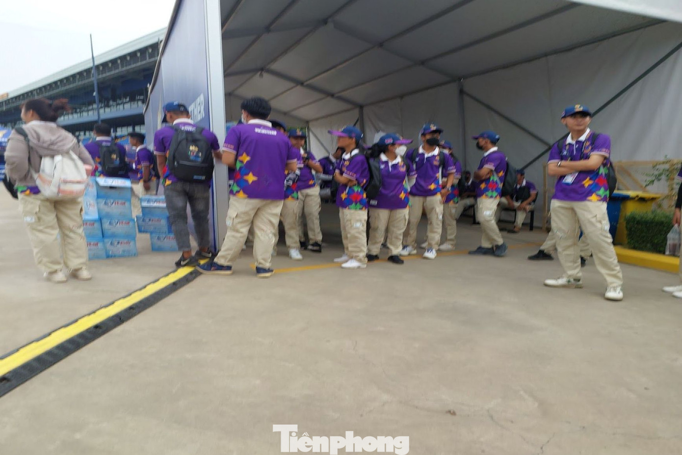 Chiều 30/4, sân Prince diễn ra loạt trận mở màn bảng B môn bóng đá nam SEA Games 32. Các TNV với áo phông tím là những người có mặt sớm nhất để hỗ trợ công tác tổ chức. Tất cả luôn có nụ cười thường trực trên môi và sẵn sàng giúp đỡ.
