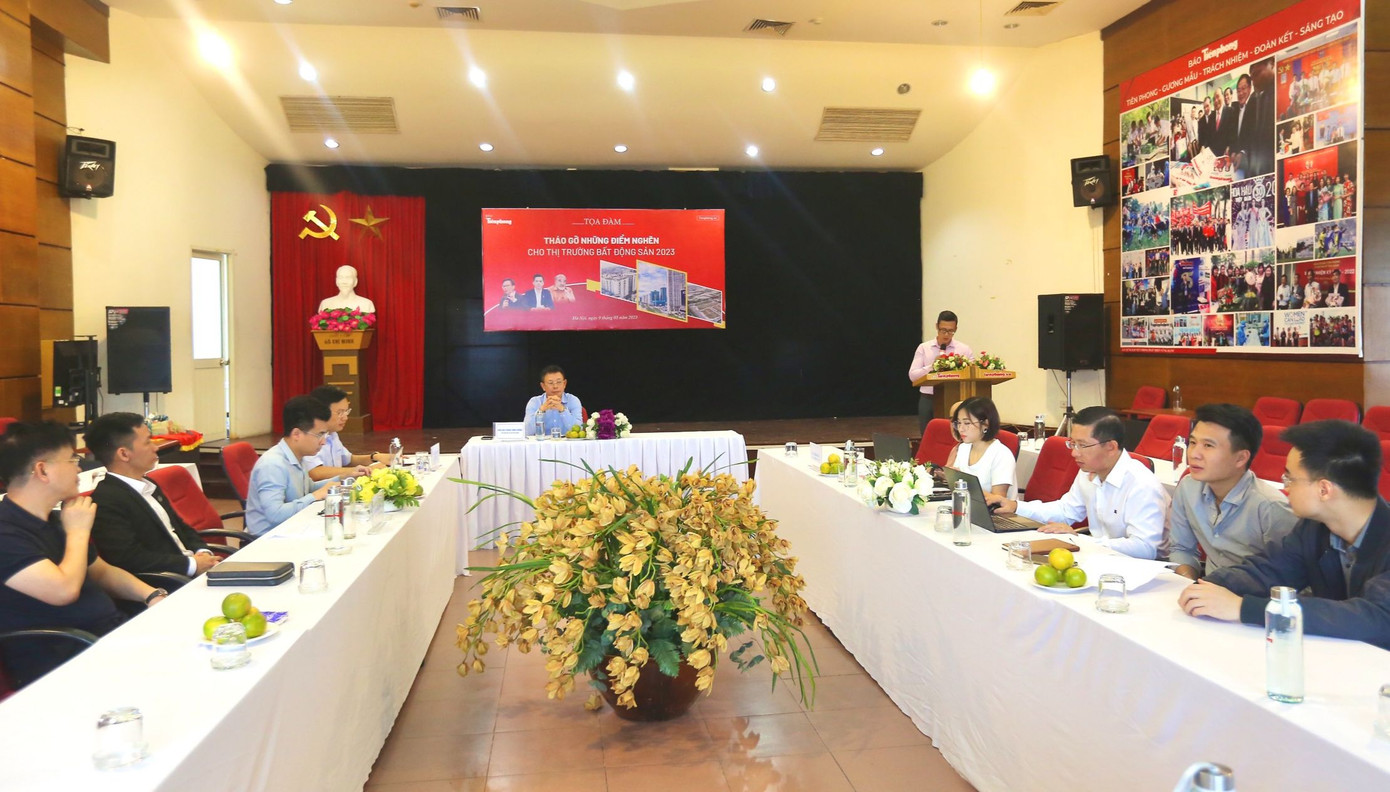 | Các vị khách mời tham dự tọa đàm: “Tháo gỡ những điểm nghẽn cho thị trường bất động sản năm 2023” tại trụ sở Báo Tiền Phong - Ảnh: Duy Phạm |
