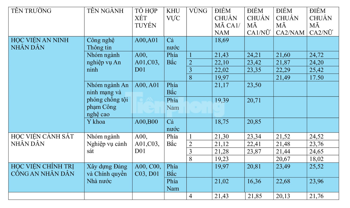 Điểm chuẩn cụ thể các học viện, trường ĐH trực thuộc Bộ Công an như sau: