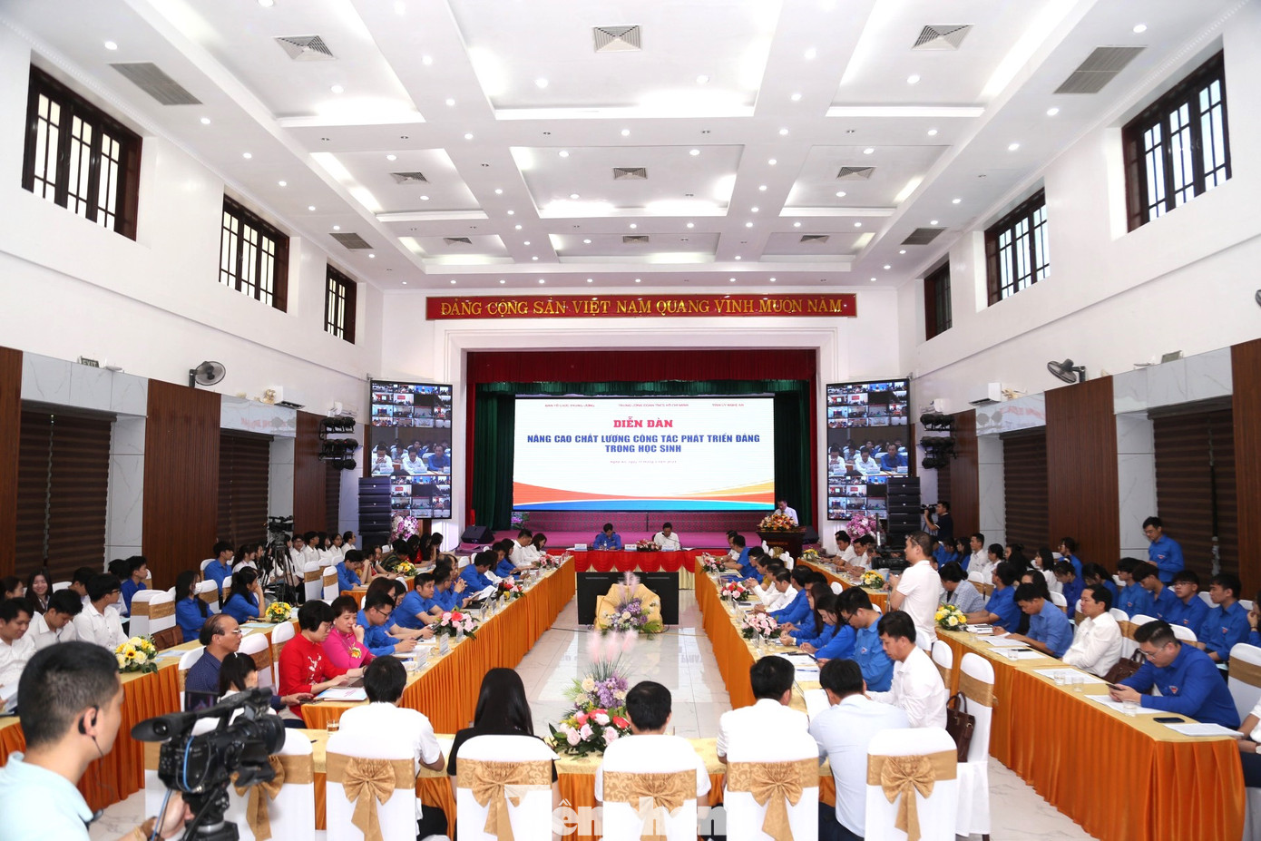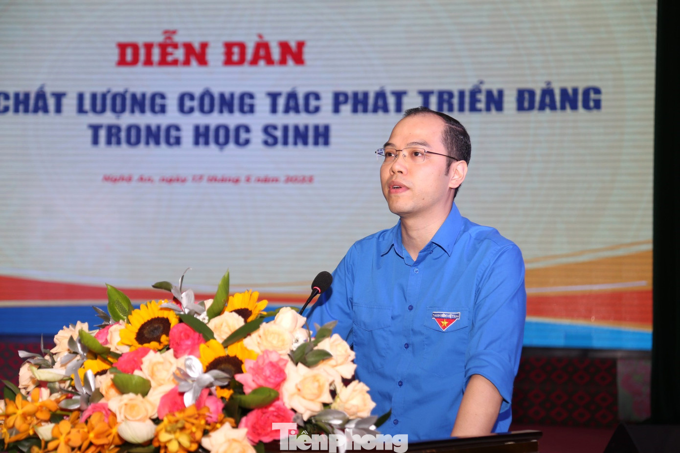 | Sáng 17/5, Trung ương Đoàn chủ trì, phối hợp với Ban Tổ chức Trung ương, Tỉnh ủy Nghệ An tổ chức diễn đàn chuyên đề “Nâng cao công tác phát triển đảng trong học sinh”. Diễn đàn được tổ chức tại Nhà khách Nghệ An với hình thức trực tiếp kết hợp với trực tuyến tại điểm cầu trung tâm, kết nối tới 900 điểm cầu cấp tỉnh và cấp huyện, với 130 đại biểu tham gia trực tiếp tại điểm cầu Nghệ An và gần 11.000 đại biểu tham gia trực tuyến. |
