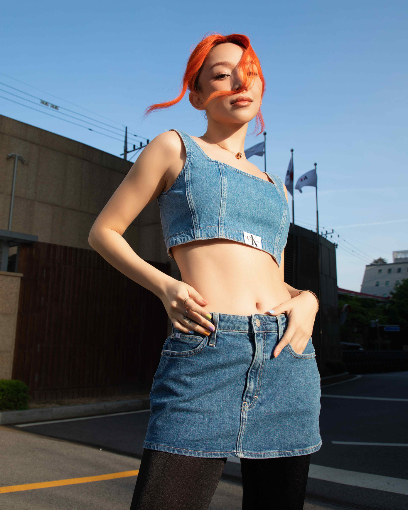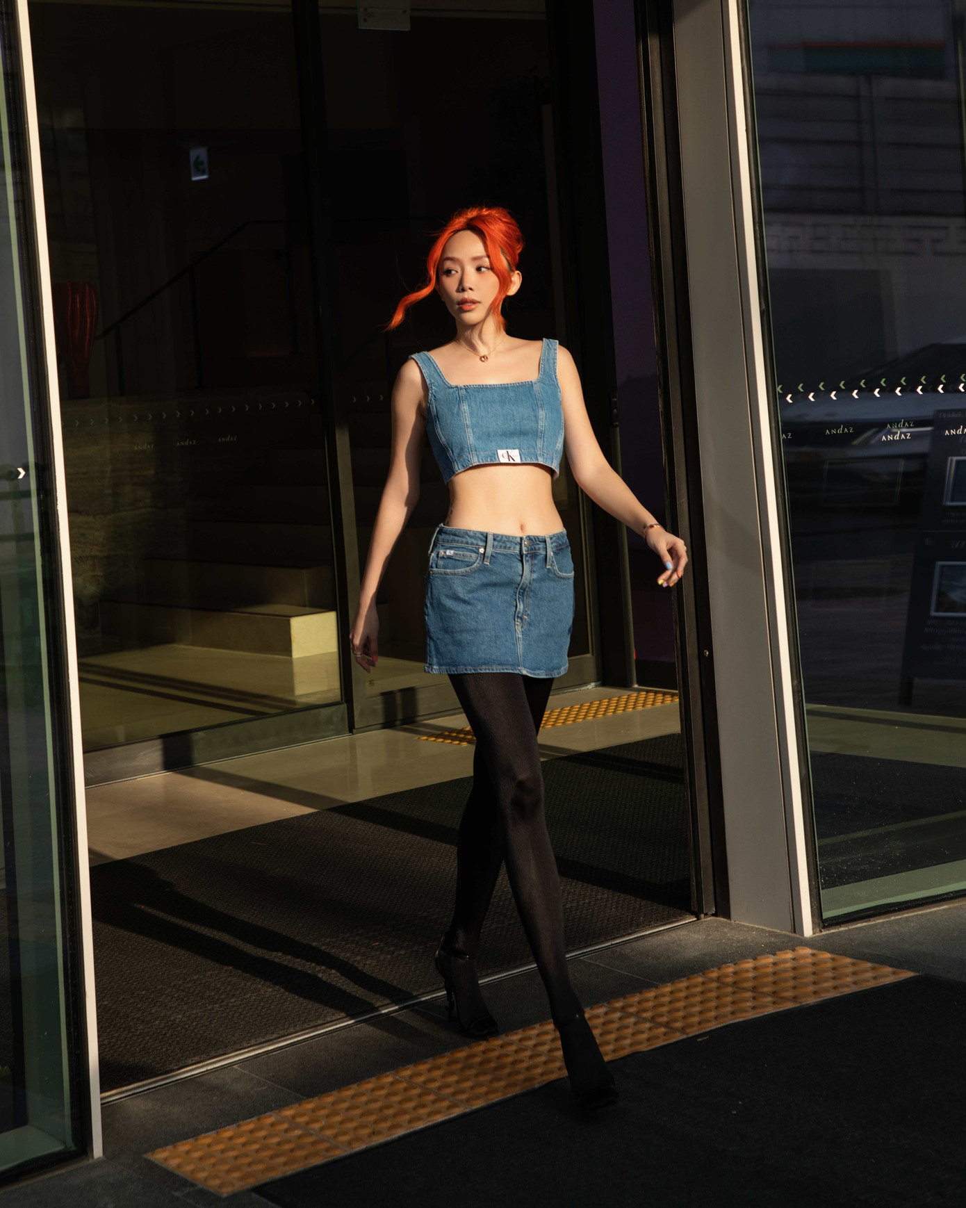Tóc Tiên cũng khéo léo chọn màu tóc cam thời thượng để tạo điểm nhấn. Phong cách mix&match giữa chất liệu jeans/denim đặc trưng của nhà mốt với tất đen và giày cao gót giúp Tóc Tiên toát lên vẻ ngoài phá cách.