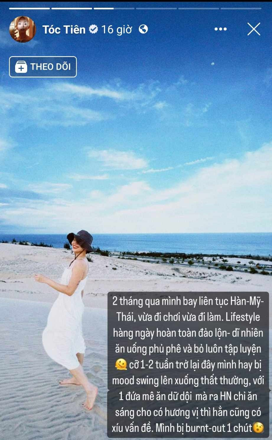 Tóc Tiên cho biết: "Hai tháng qua mình bay liên tục Hàn - Mỹ - Thái, vừa đi chơi vừa đi làm. Phong cách sống hàng ngày hoàn toàn đảo lộn, dĩ nhiên ăn uống phủ phê và bỏ luôn tập luyện. Cỡ 1, 2 tuần trở lại đây mình hay bị tâm trạng thay đổi, lên xuống thất thường, với một đứa mê ăn dữ dội mà ra Hà Nội chỉ ăn sáng cho có hương vị thì hẳn cũng có xíu vấn đề. Mình bị kiệt sức một chút".
