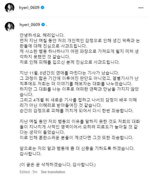 Chiều 18/3, Hyeri đăng tâm thư xin lỗi lên Instagram cá nhân. Cô cho biết mình đã hành động theo cảm xúc mà không lường trước ảnh hưởng. Sau khoảng 3 tiếng, Hyeri xóa bài đăng.
