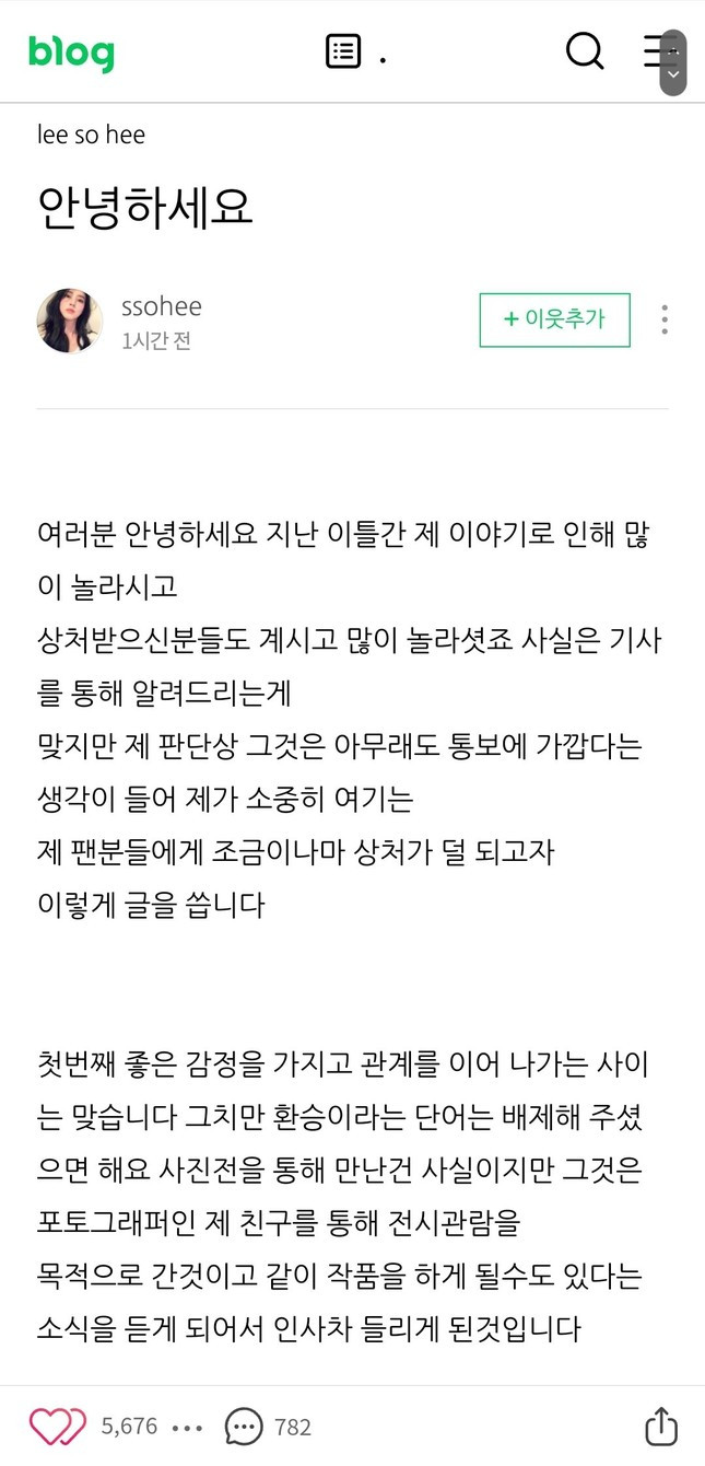 | Một phần bài đăng ngày 29/3 của Han So Hee. |