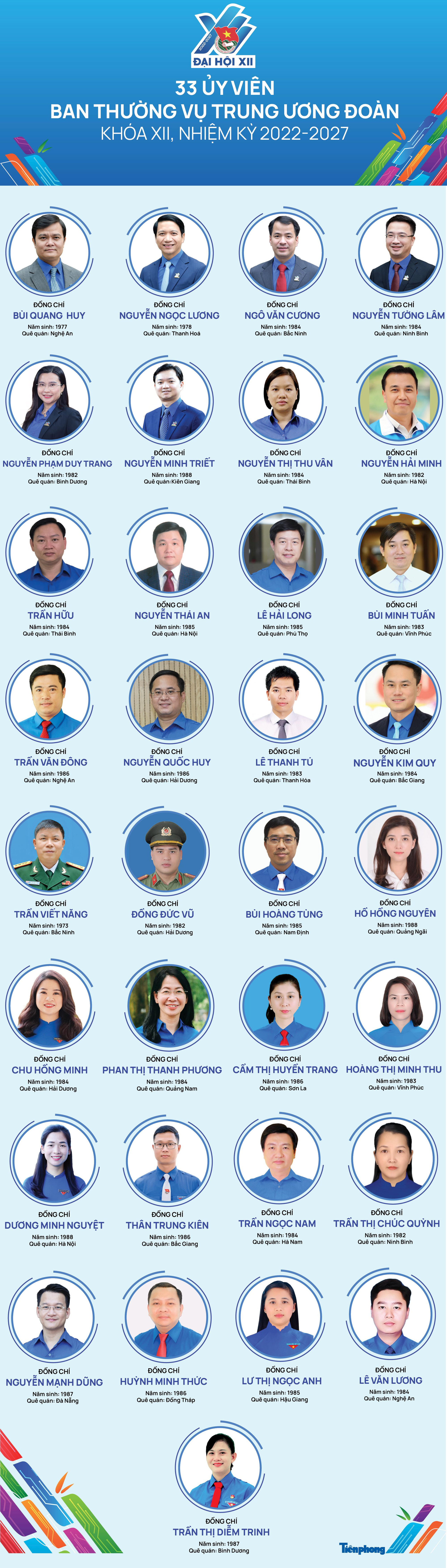 Năm Bí thư T.Ư Đoàn khóa XI gồm các anh, chị: Nguyễn Ngọc Lương, Nguyễn Phạm Duy Trang, Ngô Văn Cương, Nguyễn Tường Lâm, Nguyễn Minh Triết cùng tái đắc cử Bí thư T.Ư Đoàn khóa XII, nhiệm kỳ 2022 – 2027.