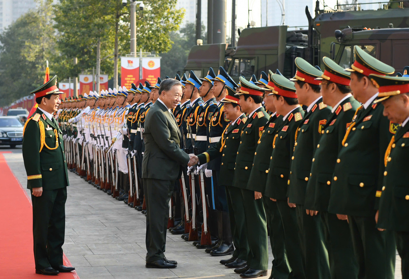 | Tổng Bí thư Tô Lâm - Bí thư Quân ủy Trung ương tới dự Lễ kỷ niệm 80 năm Ngày thành lập Quân đội nhân dân Việt Nam (22/12/1944 - 22/12/2024), 35 năm Ngày hội Quốc phòng toàn dân (22/12/1989 - 22/12/2024). Trong ảnh: Đội danh dự Quân đội nhân dân Việt Nam đón Tổng Bí thư Tô Lâm - Bí thư Quân ủy Trung ương tới dự Lễ kỷ niệm sáng 20/12. |