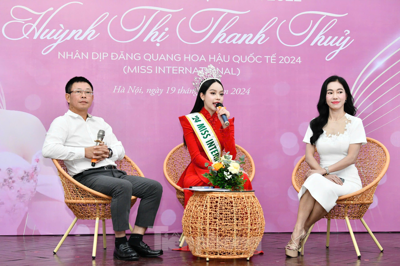 Xuất hiện rạng rỡ tại buổi giao lưu, Hoa hậu Huỳnh Thị Thanh Thủy bày tỏ niềm xúc động trước sự đón tiếp nồng nhiệt của báo Tiền Phong cùng các cơ quan thông tấn báo chí. Cô cho biết vui và bồi hồi khi lắng nghe bài phát biểu của Tổng biên tập báo Tiền Phong Phùng Công Sưởng.