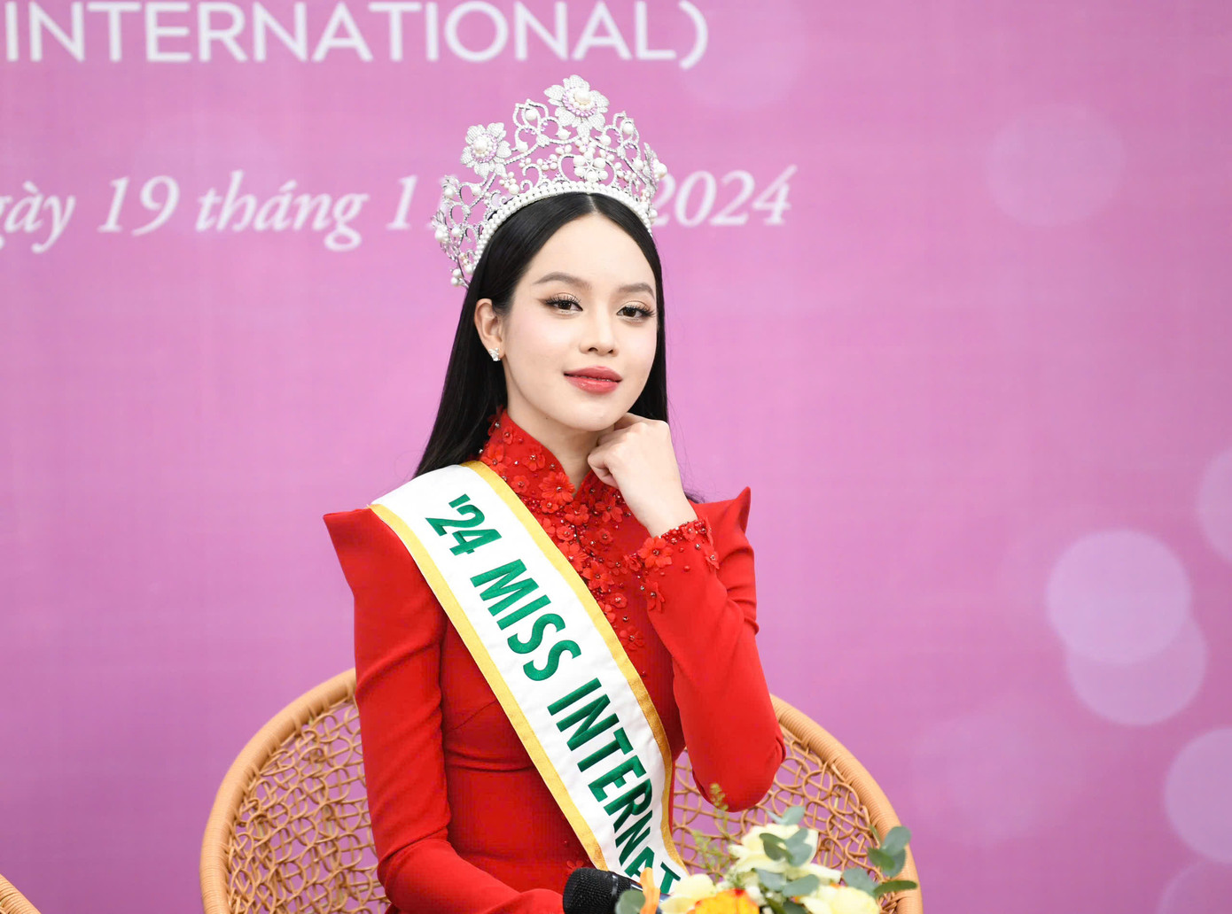 | Người đẹp sinh năm 2002 xuất hiện rực rỡ trong tà áo dài truyền thống đỏ tươi và vương miện Hoa hậu Quốc tế 2024. |