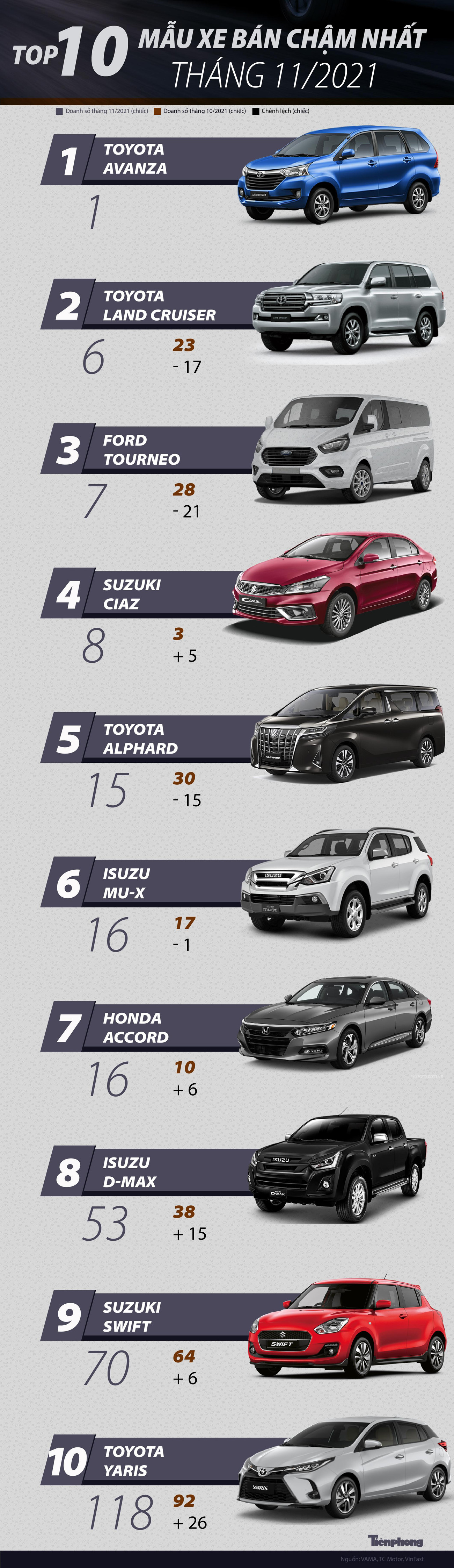 TPO - Toyota Avanza với chỉ 1 chiếc bán ra tháng vừa qua chính là mẫu xe bán chậm nhất, ngoài ra còn có thêm 3 mẫu xe Toyota khác lọt vào danh sách này.
