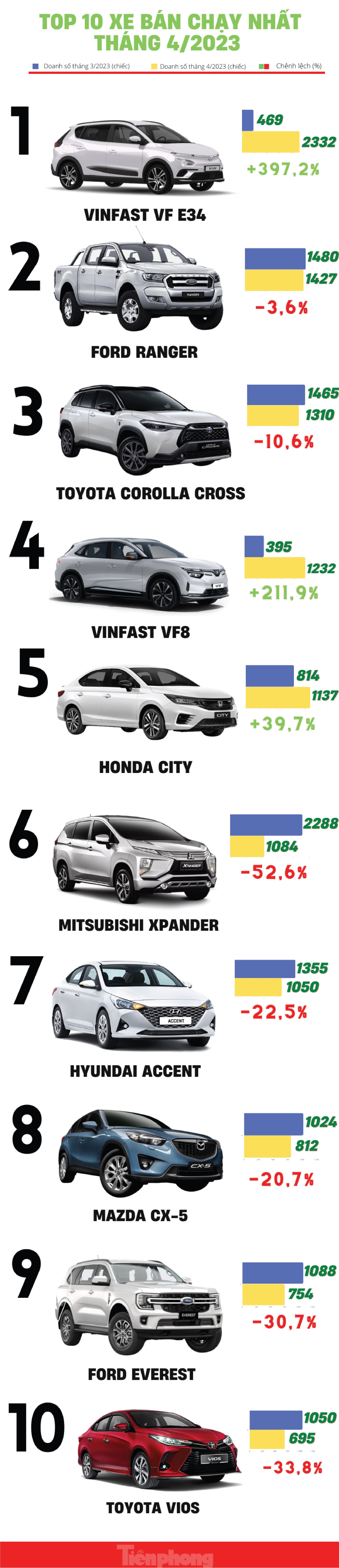 Top 10 xe bán chạy nhất tháng 4 tại Việt Nam