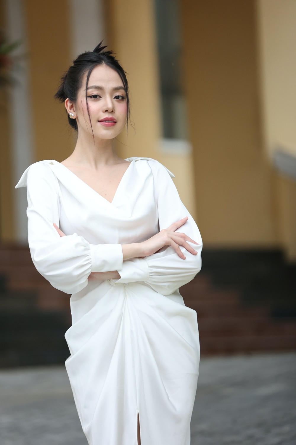 Hoa hậu Huỳnh Thị Thanh Thủy chọn thiết kế dài tay với phần cổ cách điệu, phần eo đính hoa, phần hông xếp nếp điệu đà, mang đến cảm giác thanh lịch.