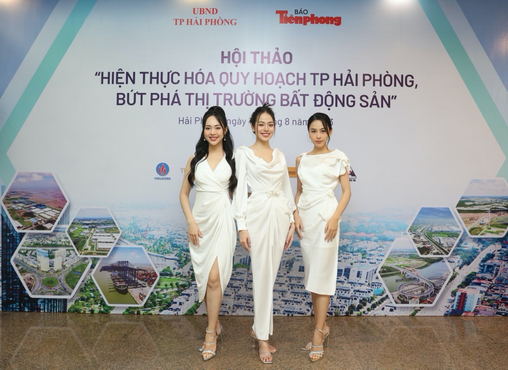 HHTO - Tham dự Hội thảo “Hiện thực hóa quy hoạch TP Hải Phòng, bứt phá thị trường bất động sản” do Báo Tiền Phong phối hợp UBND TP Hải Phòng tổ chức, Top 3 Hoa hậu Việt Nam 2022 gồm Hoa hậu Thanh Thủy, Á hậu Thùy Linh và Á hậu Ngọc Hằng cùng chọn váy trắng thanh lịch, khoe nhan sắc dịu dàng.