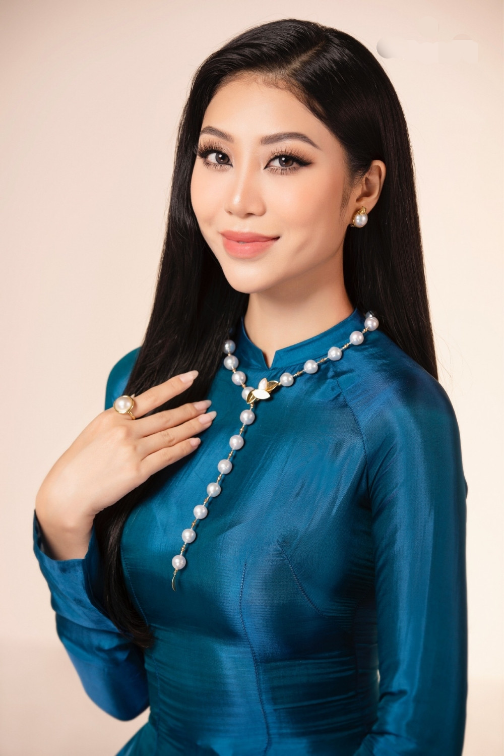 Miss Earth Water (Hoa hậu Nước) 2023 Đỗ Thị Lan Anh mặc áo dài màu xanh biển, màu của Nước.