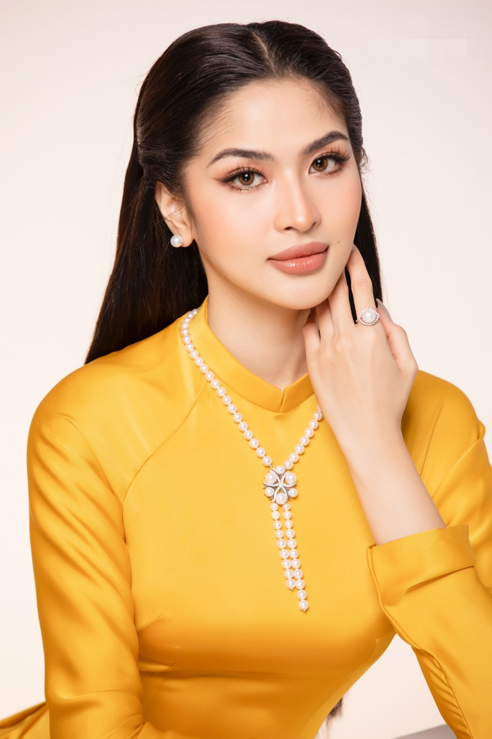 Miss Earth Air (Hoa hậu Không khí) 2023 Yllana Marie Aduana chuẩn con gái Việt trong tà áo dài vàng, tượng trưng cho Không khí.