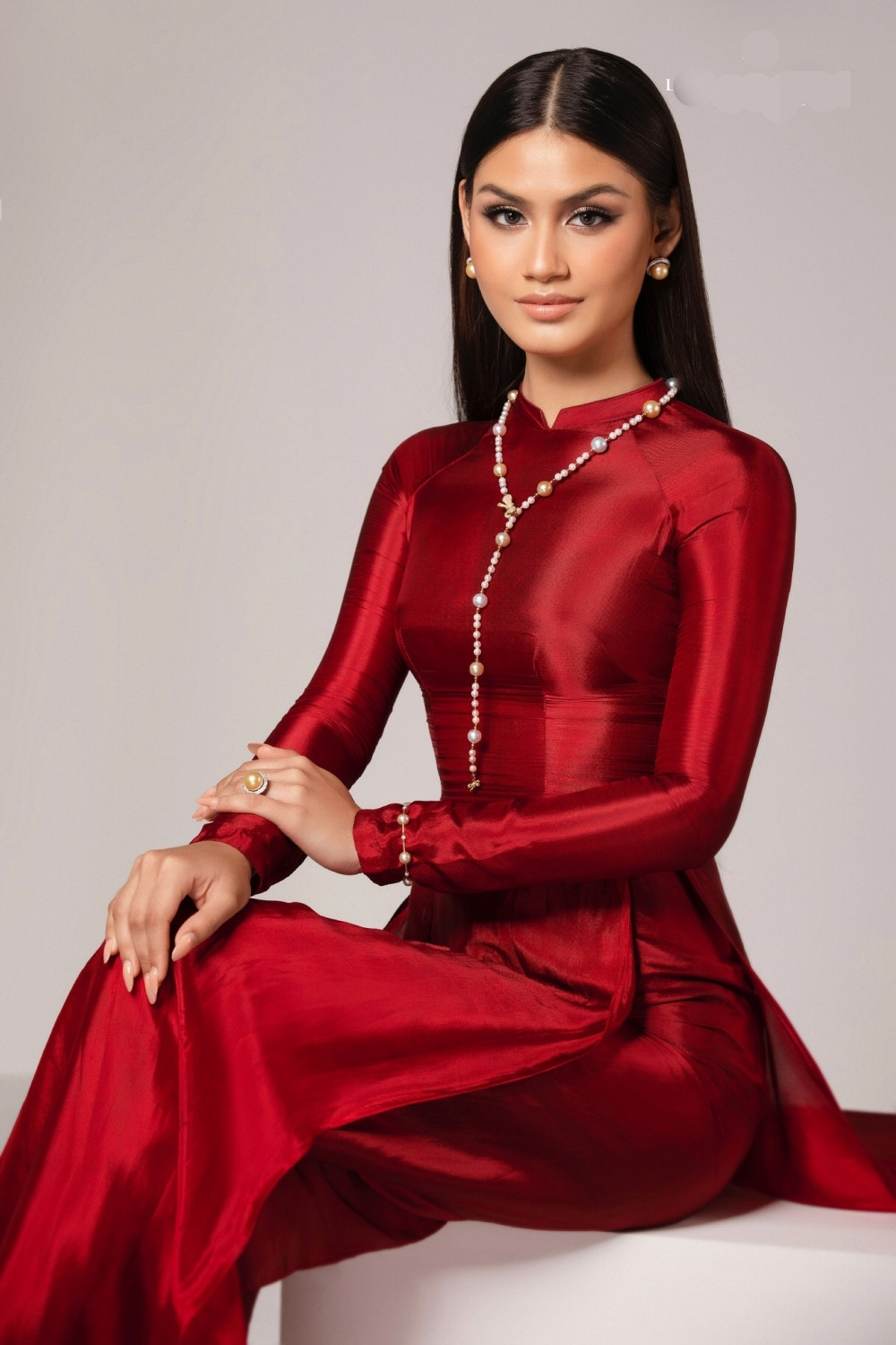 Miss Earth Fire (Hoa hậu Lửa) 2023 Cora Bliault mặc áo dài màu đỏ, màu của Lửa, cô bạn cũng được khen xinh đẹp đúng chuẩn con gái Việt khi diện áo dài.