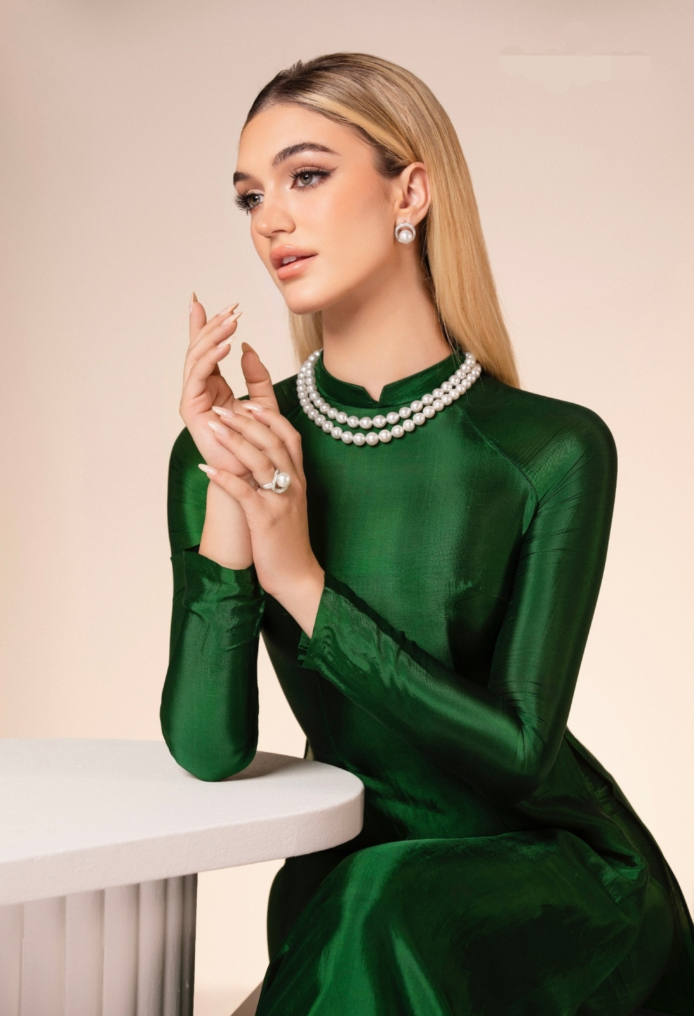 Miss Earth 2023 Drita Ziri xinh đẹp dịu dàng với tà áo dài màu xanh lá, tượng trưng cho Trái Đất.