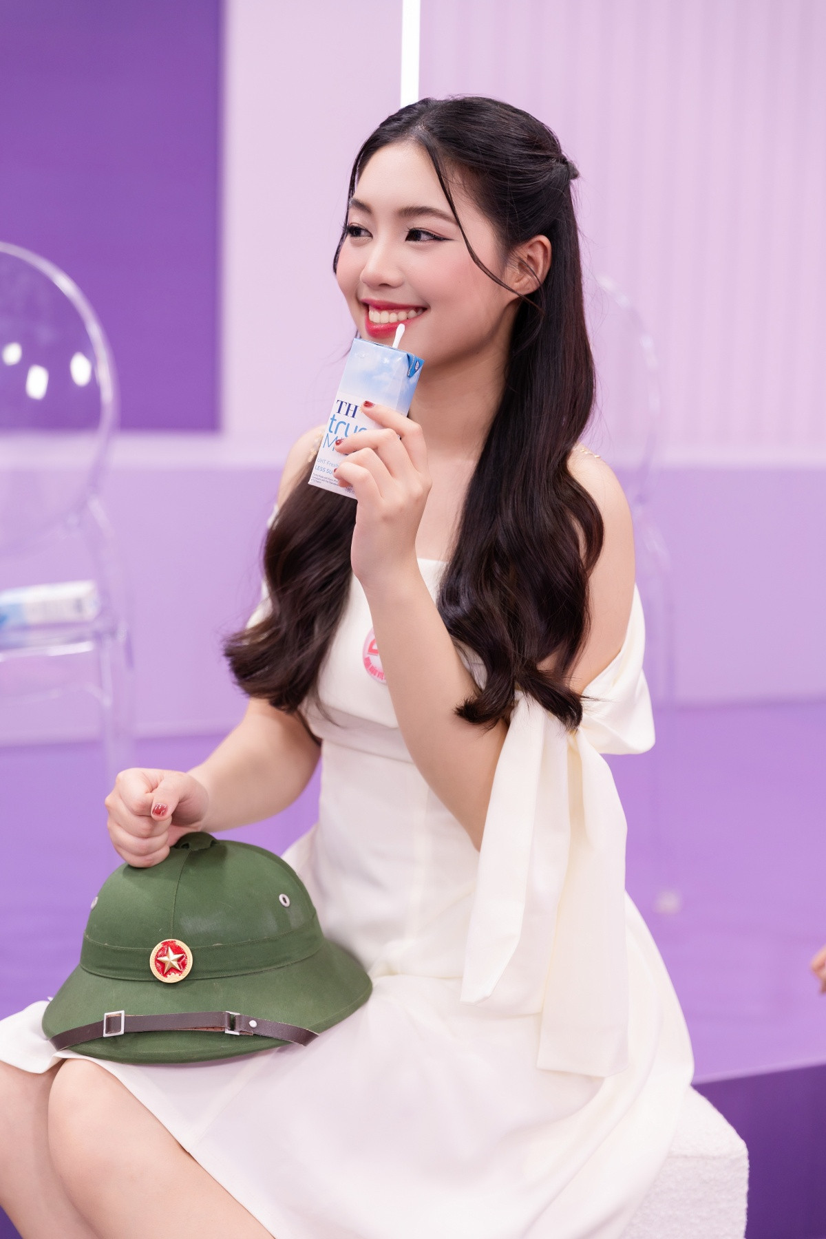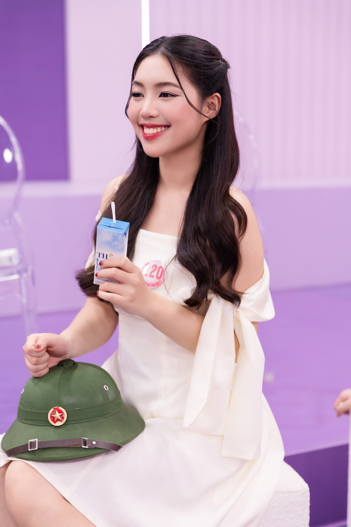 Phạm Thị Thanh Xuân (ngoài cùng bên trái) thu hút khi diện áo dài Nhật bình, trang phục truyền thống đặc trưng của cố đô Huế. Cô bạn mang theo chiếc nón lá, đồ vật gắn liền với công việc thuần nông, dãi nắng dầm sương của cha mẹ.