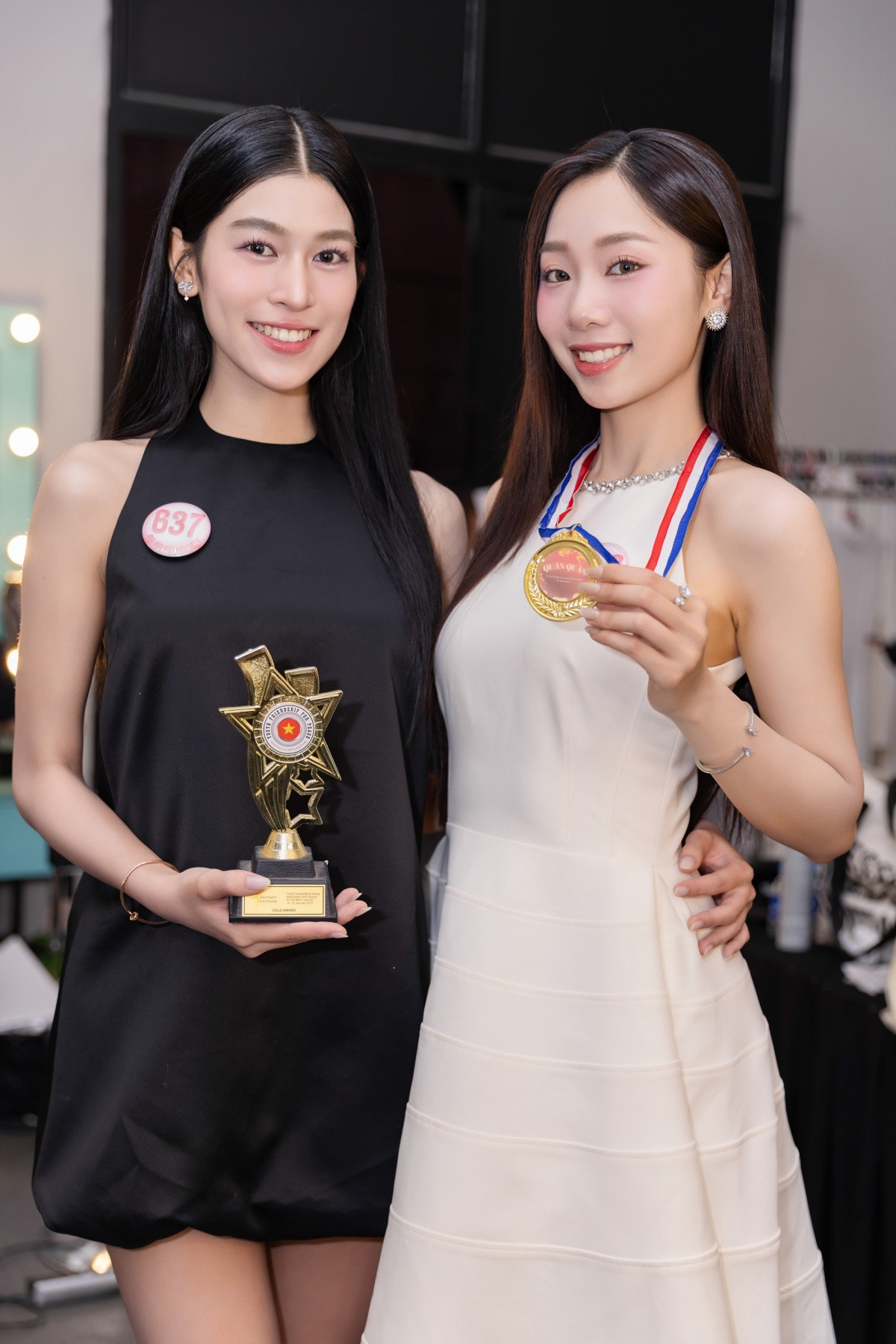 Nguyễn Thanh Thảo (trái) tự hào với chiếc cúp Vàng ở Liên hoan Nghệ thuật châu Á - Thái Bình Dương năm 2019 và Phạm Thùy Dương (phải) khoe huy chương Quán quân một cuộc thi MC.