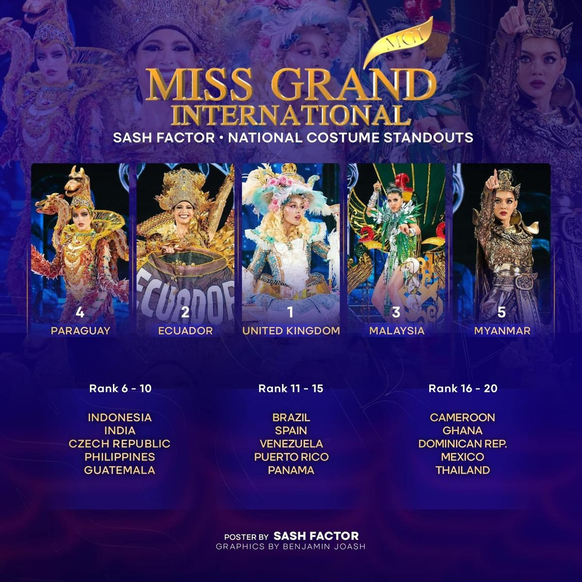 Chuyên trang sắc đẹp Sash Factor vừa xếp hạng những bộ trang phục dân tộc đẹp nhất ở đêm thi vừa qua. Mỗi thí sinh Miss Grand International 2024 đều mang đến những thiết kế vô cùng lộng lẫy, cầu kỳ, đẹp rực rỡ khiến khán giả thật khó chọn ra đâu là những trang phục ấn tượng nhất.