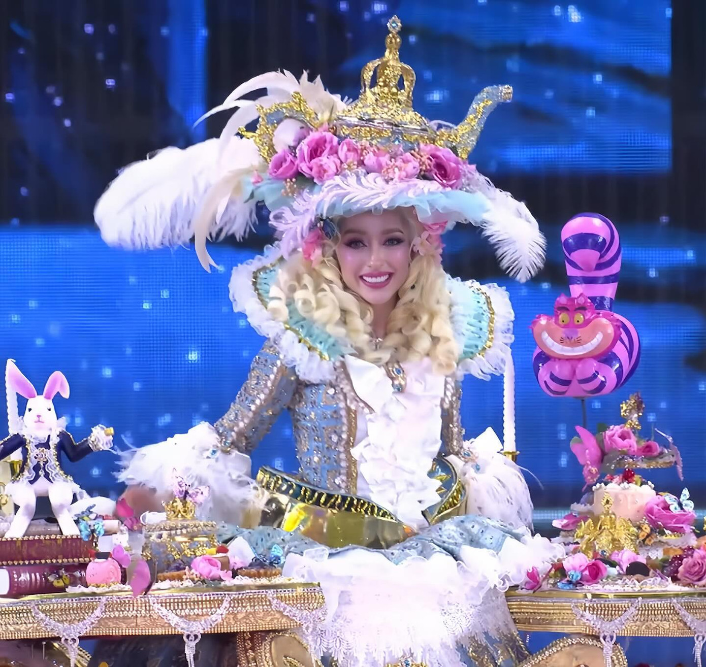 Trang phục Dân tộc của đại diện nước Anh được lấy cảm hứng từ bữa trà chiều trong Alice Ở Xứ Sở Thần Tiên. Trà chiều vốn là phong tục đặc trưng của người Anh từ hàng trăm năm qua và bộ váy đã mang đến cả một bữa tiệc trà tinh xảo, nhiều màu sắc. Chiếc mũ hình ấm trà, hai bên thân váy là các khay đựng bánh mứt cùng với những nhân vật quen thuộc trong cuốn sách, chân váy kết đầy hoa hồng… khiến ai nhìn cũng như bước vào một không gian cổ tích.