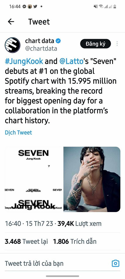 Đỉnh cao nhất là Seven đã debut No.1 Spotify Global với 15,99 triệu stream, phá kỷ lục dành cho màn hợp tác có thành tích cao nhất trong ngày đầu tiên trên BXH này.