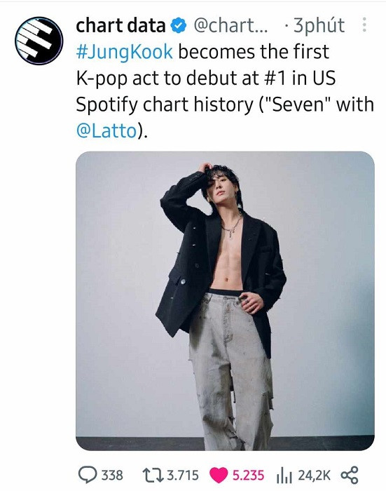 Jung Kook trở thành Nghệ sĩ K-Pop đầu tiên debut No.1 trên BXH Spotify của Mỹ với hơn 2 triệu stream.