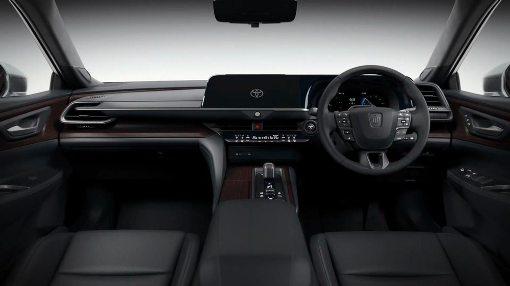 Ở phía táp lô, Crown sử dụng hai màn hình 12,3 inch được gắn trên cùng một bảng điều khiển và nhiều nút bấm chức năng trên vô lăng. Giống như những phiên bản tiền nhiệm, sedan Crown không mang logo của Toyota, vì nó đã phát triển thành một thương hiệu phụ với bản sắc riêng biệt.