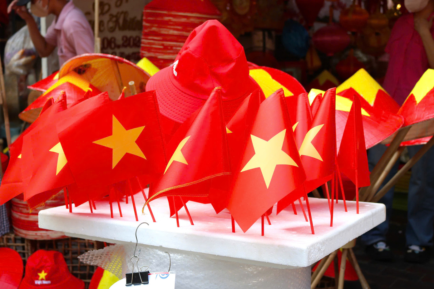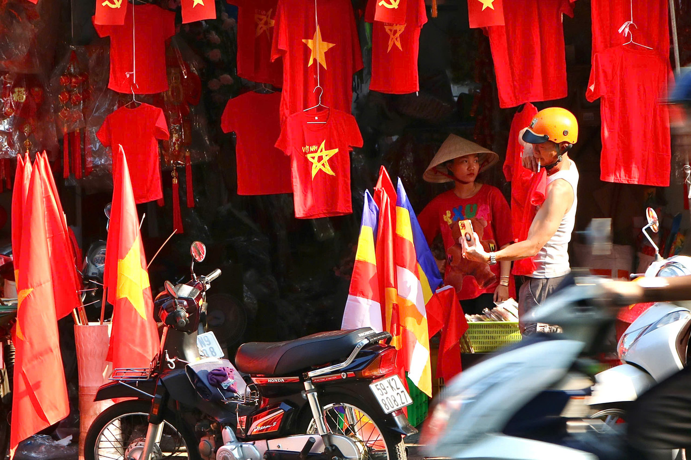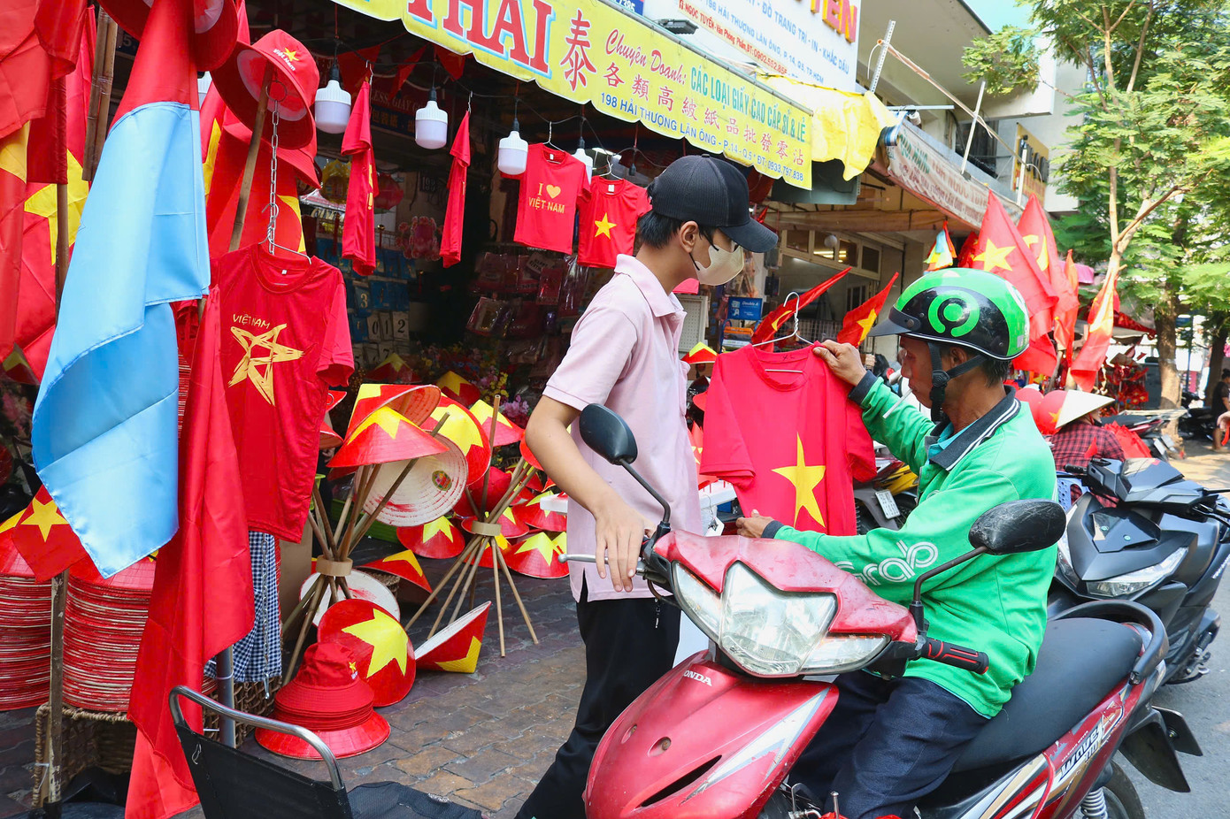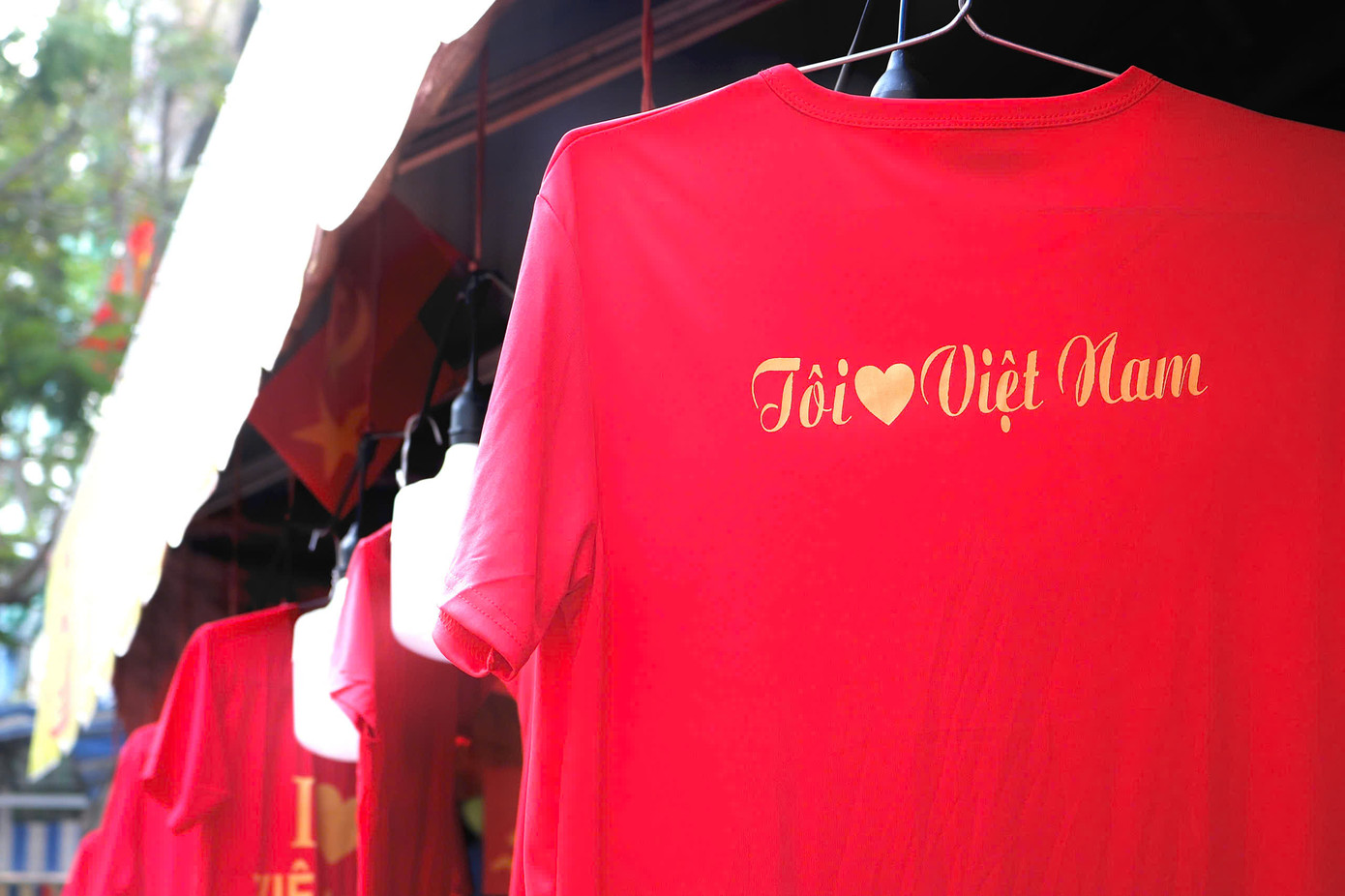 | Theo những tiểu thương ở đây, mặt hàng bán chạy nhất là những lá cờ Việt Nam nhỏ và áo cờ đỏ sao vàng. |