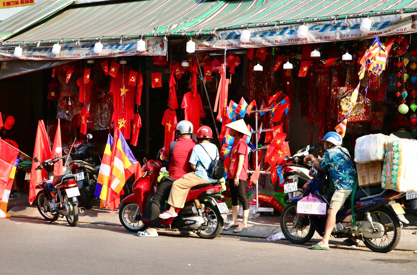 SVO - Không khí rộn ràng đang phủ khắp đường Hải Thượng Lãn Ông (Q. 5, TP. HCM), với nhiều mặt hàng rợp màu cờ đỏ sao vàng. Đông đảo người dân và bạn trẻ ghé đây mua cờ, nón, áo... để hòa nhịp cùng Đại lễ 30/4.