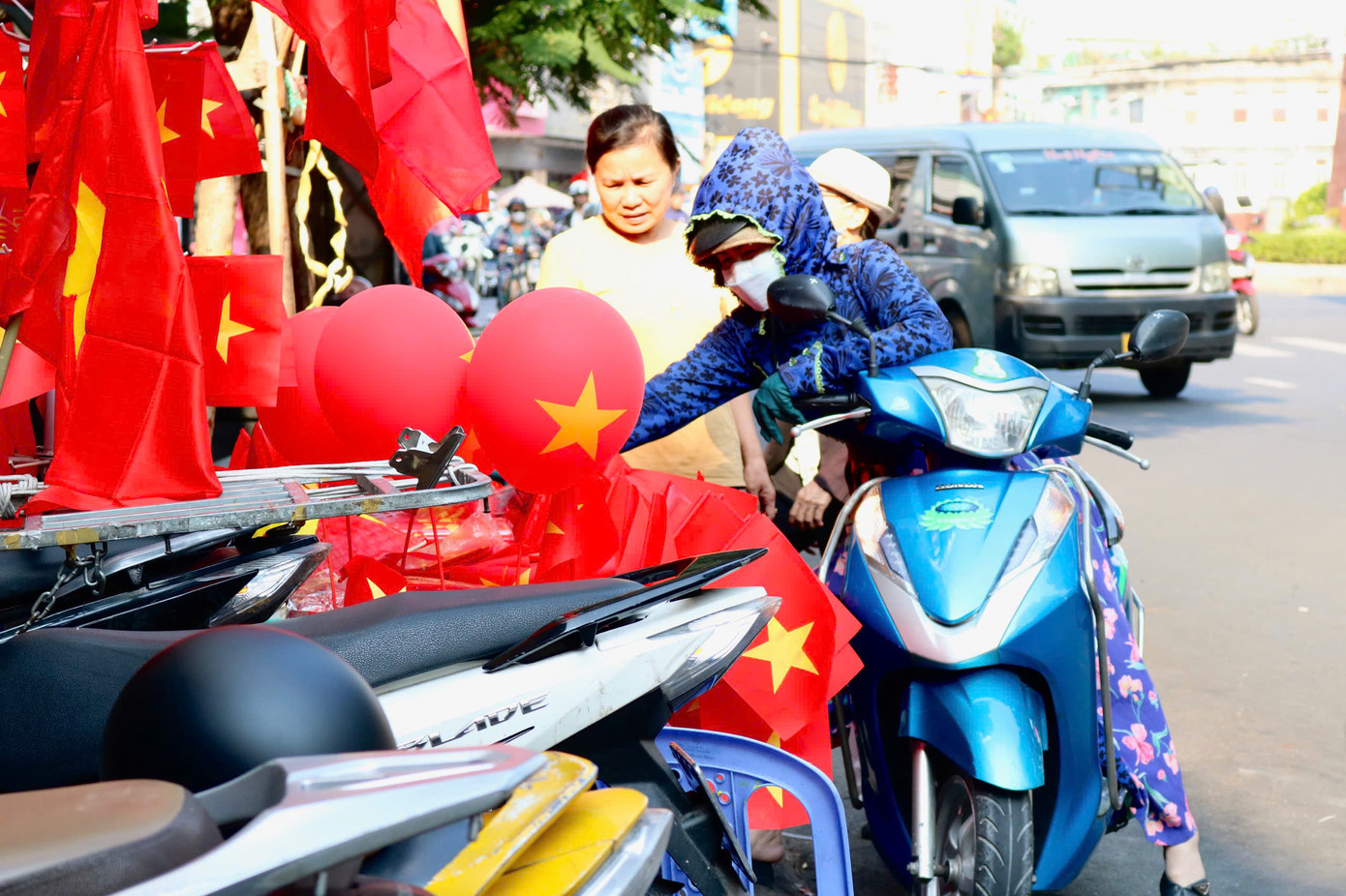| Minh Nhật (18 tuổi, Q.3) ngay sau khi tan học đã liền ghé qua đây để sắm cho mình lá cờ nhỏ trang trí lên xe máy. “Những ngày gần đây, khi đi học, mình nhìn thấy rất nhiều xe có trang trí cờ Tổ quốc, không chỉ có xe 2 bánh mà còn có nhiều loại xe khác. Nhìn những lá cờ tung bay khắp phố, mình cảm thấy trong lòng dâng lên một niềm tự hào sâu sắc. Do đó mình cũng muốn hòa chung vào không khí rộn ràng của Đại lễ 30/4 bằng cách này”, Nhật hào hứng chia sẻ. |