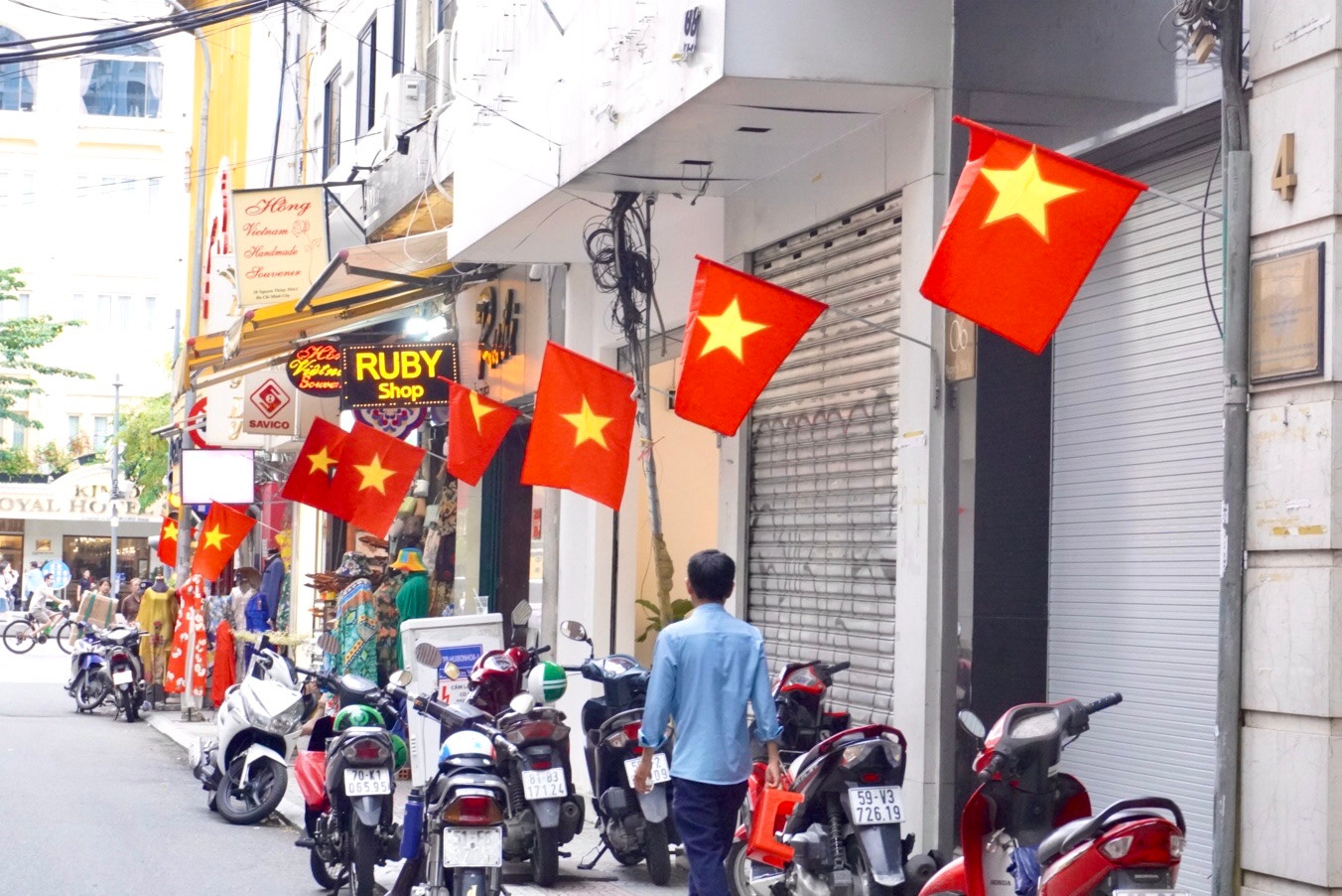 | Con đường Mạc Đĩnh Chi (Q. 1) treo pano chào đón ngày Lễ lớn của dân tộc. |