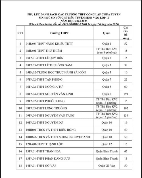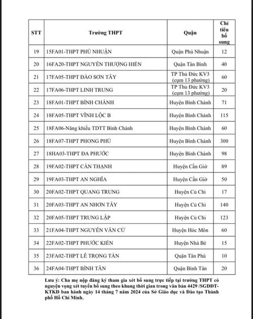 Đối với thí sinh đã học THCS tại các khu vực: Cần Giờ, Nhà Bè, Bình Chánh, Hóc Môn, Củ Chi và thành phố Thủ Đức, nếu đăng ký nguyện vọng THPT cùng khu vực thì sẽ được xét theo điểm chuẩn Nguyện vọng 1 của trường THPT công lập đó. Trong đó, thành phố Thủ Đức được chia thành 3 khu vực. Khu vực 1 (KV1) gồm các trường thuộc Quận 2 cũ, khu vực 2 (KV2) bao gồm các trường thuộc Quận 9 cũ và khu vực 3 (KV3) bao gồm các trường thuộc Quận Thủ Đức cũ. Dưới đây là danh sách 36 trường tuyển sinh bổ sung vào lớp 10: