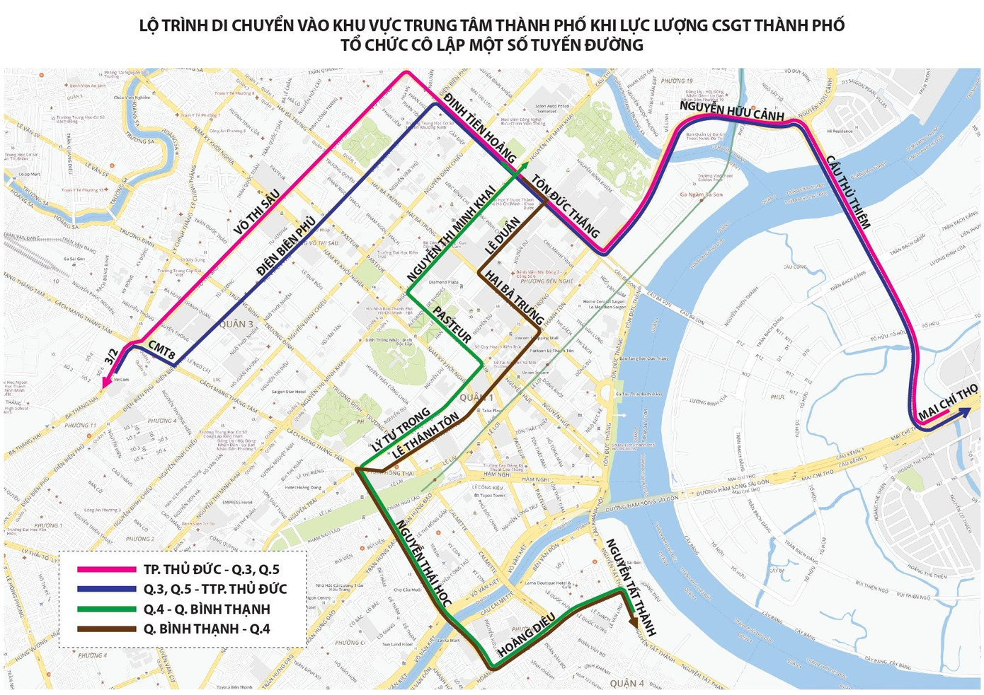 Để hạn chế lượng phương tiện di chuyển tiếp tục di chuyển hướng về khu vực cô lập, lực lượng CSGT sẽ triển khai công tác phân luồng từ xa đối với: giao lộ Nguyễn Hữu Cảnh – Tôn Đức Thắng (các phương tiện từ hướng Nguyễn Hữu Cảnh rẽ phải hoặc đi thẳng vào đường Lê Thánh Tôn), giao lộ Lê Duẩn - Đinh Tiên Hoàng (hạn chế phương tiện ô tô từ Lê Duẩn rẽ vào đường Tôn Đức Thắng). Tại khu vực giao lộ Tôn Đức Thắng – Nguyễn Hữu Cảnh (các phương tiện di chuyển theo hướng ngược lại, không hướng về khu vực trung tâm). Tại vòng xoay Công trường Mê Linh, các phương tiện không được di chuyển vào khu vực cô lập mà phải chuyển hướng qua đường Hai Bà Trưng hoặc qua đường Tôn Đức Thắng để ra khỏi khu vực cô lập.