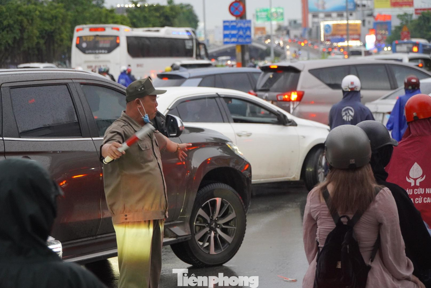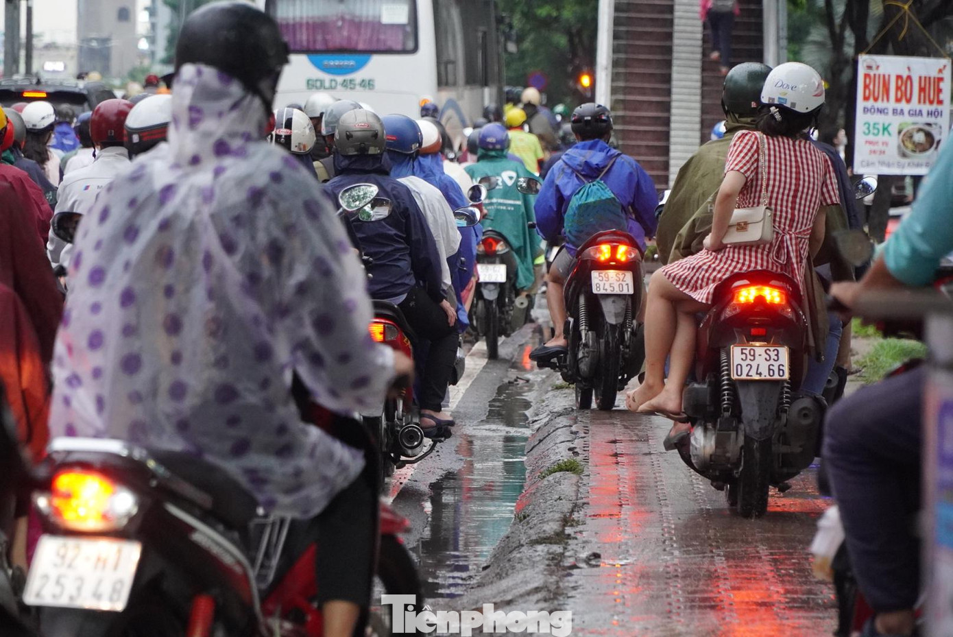 | Dòng phương tiện chen chúc di chuyển sau mưa. |