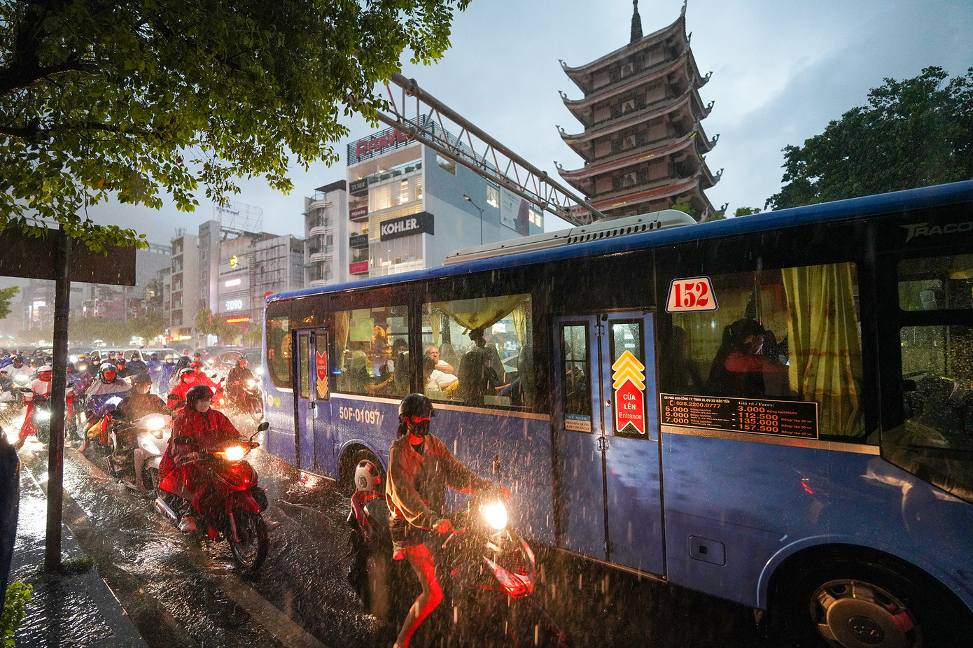| Mưa lớn đúng giờ tan sở khiến nhiều tuyến đường bị ùn ứ. |