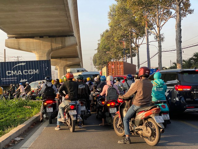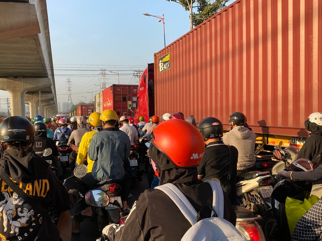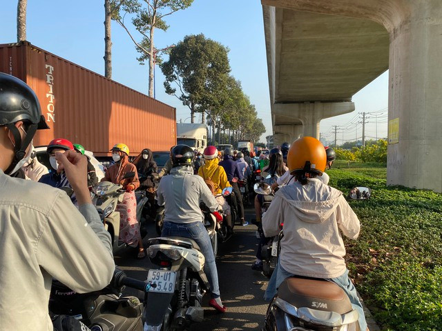 Đến 8 giờ sáng 30/1, tình hình giao thông trên đường song hành Võ Nguyên Giáp, TP Thủ Đức (TP HCM), đoạn gần cảng Phước Long ICD vẫn ùn ứ nghiêm trọng.