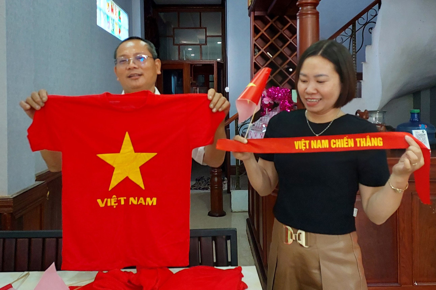 Vừa nói, anh Oanh vừa khoe những chiếc áo cờ đỏ sao vàng mới đặt, cờ Tổ quốc và băng rôn, sticker cổ vũ. "Chúng tôi sẽ nhuộm đỏ sân sân KM16 (tức New Laos National Stadium)", anh cười, tay giơ chiếc áo đỏ với ngôi sao vàng đầy tự hào.
