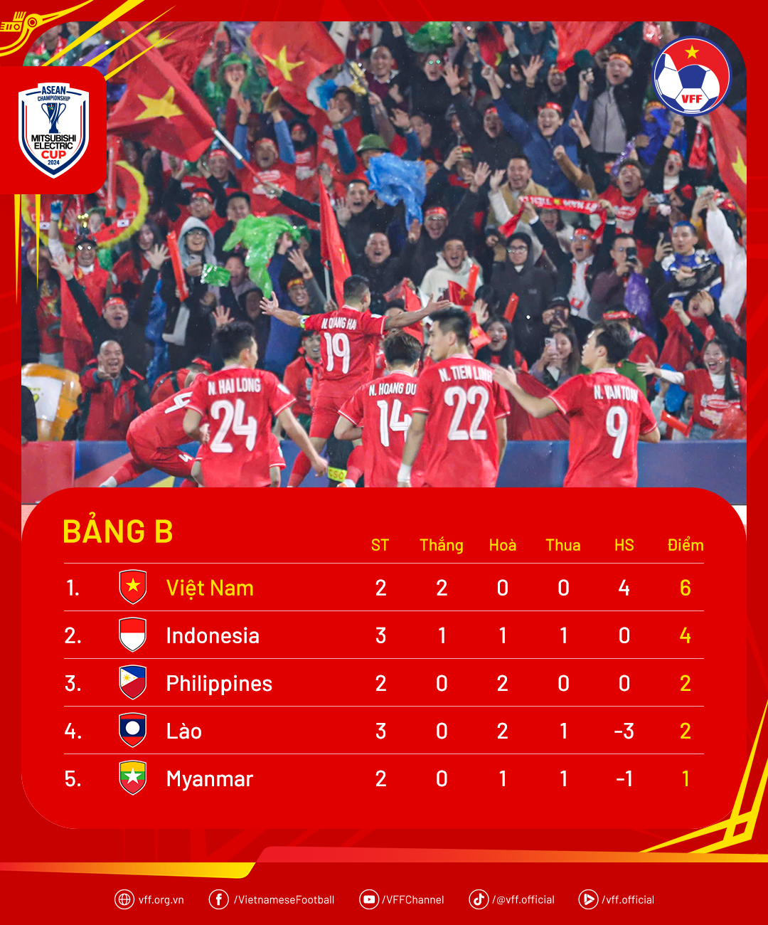 Cụ thể, nếu ĐT Việt Nam hôm nay thắng ĐT Philippines và giành 3 điểm, ĐT Việt Nam sẽ chắc chắn có ngôi đầu bảng B, bởi các đội bóng còn lại không thể vươn đến điểm số 9. Điều đó có nghĩa, đoàn quân của HLV Kim Sang Sik có quyền thắng 1 trong 2 trận đấu còn lại. Kịch bản tốt nhất với ĐT Việt Nam là giành chiến thắng trước ĐT Philippines, khi đó trận đấu với ĐT Myanmar trên sân nhà Phú Thọ dù thắng hay thua cũng không còn quá quan trọng.
