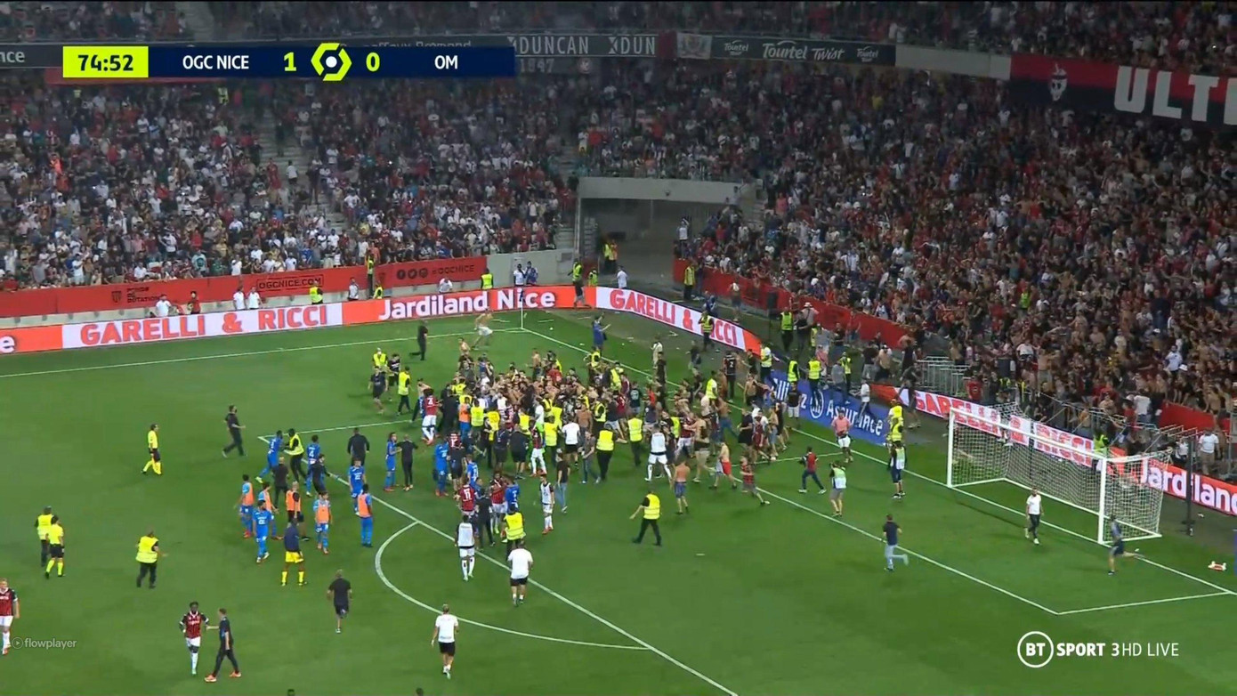 Các cầu thủ Marseille tiến vào phòng thay đồ để tránh nạn và nhất quyết không chịu quay trở lại. Trận đấu buộc phải hủy bỏ, thời điểm này Nice đang dẫn trước 1-0. Theo quy định của Ligue 1, Marseille sẽ bị xử thua 0-3 vì bỏ trận đấu.