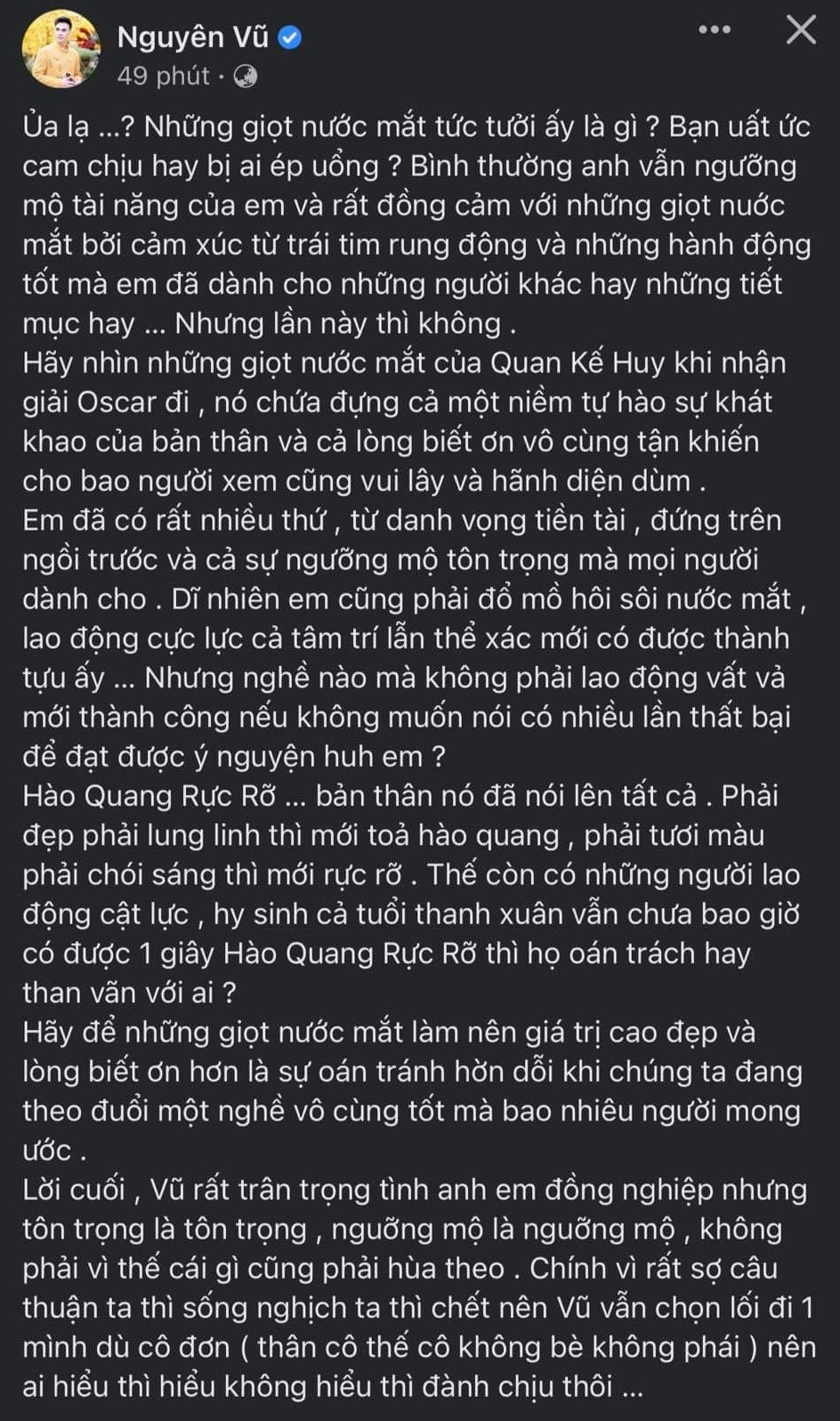 Ca sĩ Nguyên Vũ có bài đăng dài hơn để thể hiện quan điểm của mình: "Ủa lạ …? Những giọt nước mắt tức tưởi ấy là gì? Bạn uất ức cam chịu hay bị ai ép uổng? Bình thường anh vẫn ngưỡng mộ tài năng của em và rất đồng cảm với những giọt nước mắt bởi cảm xúc từ trái tim rung động và những hành động tốt mà em đã dành cho những người khác hay những tiết mục hay… Nhưng lần này thì không".