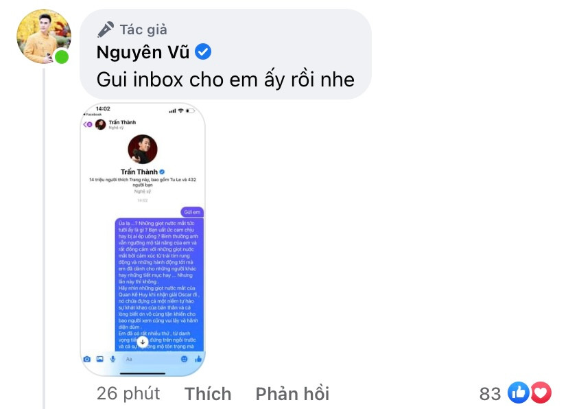 Chưa hết, Nguyên Vũ còn hành động rất quyết liệt khi gửi thẳng tin nhắn cho Trấn Thành để bày tỏ quan điểm của mình.