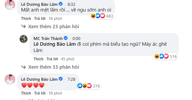 Không chỉ được Lý Hải hiểu mà Trấn Thành còn được loạt sao Việt ủng hộ, động viên trong thời điểm "nhạy cảm" này. Lê Dương Bảo Lâm để lại loạt icon trái tim khuyên anh về ngủ sớm, trong khi nhạc sĩ Nguyễn Hồng Thuận bình luận: "Hôm qua mới đi quay show chung với anh Hải anh em có nói chuyện về việc này rồi anh Hải cười hề hề ổng bảo trời ơi không có gì đâu",...