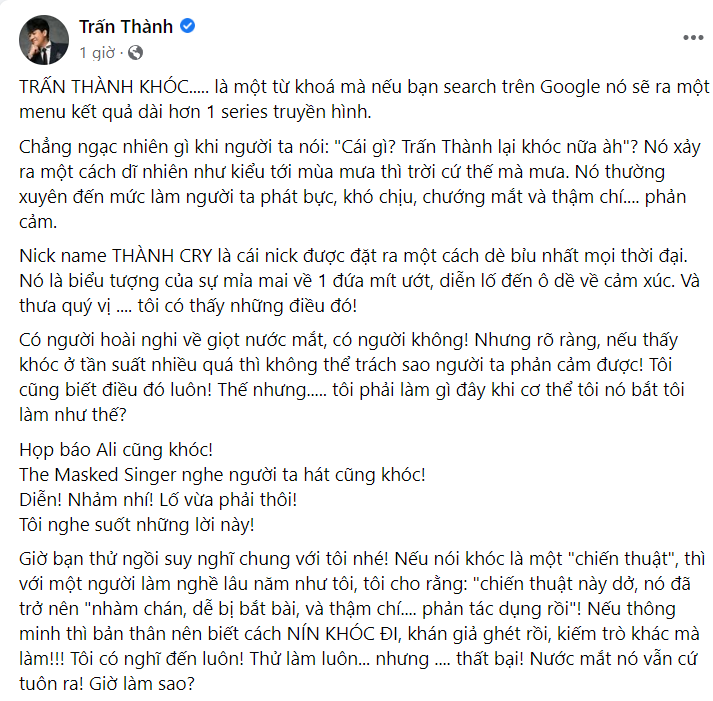 "Trấn Thành khóc là từ khóa nếu search trên Google nó sẽ ra kết quả dài hơn một series truyền hình. Họp báo Ali cũng khóc. The Masked Singger nghe người ta hát cũng khóc. Diễn! Nhảm nhí! Lố vừa phải thôi! Tôi nghe suốt những lời này" - Trấn Thành bộc bạch.