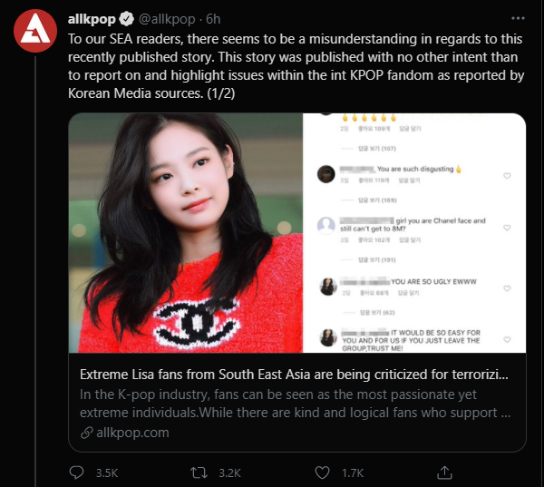 | Người hâm mộ của Lisa đã tạo hashtag #AllkpopRacist trên Twitter, yêu cầu allkpop đưa ra lời giải thích và xin lỗi về các cáo buộc trên. |