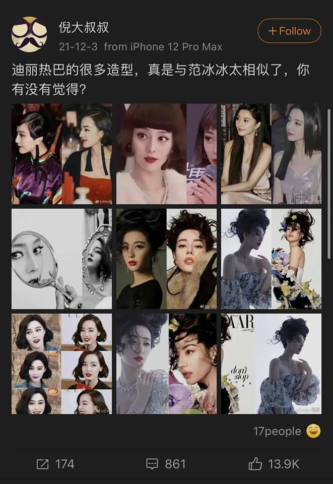 Diện mạo của nữ minh tinh nhanh chóng gây sốt, lọt Top 1 hot search Weibo với lượt thảo luận lớn. Bên cạnh những lời khen về diện mạo yêu kiều của mỹ nhân Tân Cương, nhiều ý kiến trái chiều cho rằng tạo hình của Nhiệt Ba mang theo nhiều nét tương đồng với đàn chị Phạm Băng Băng.